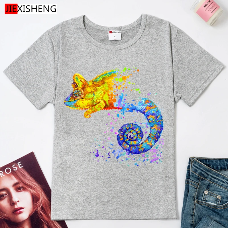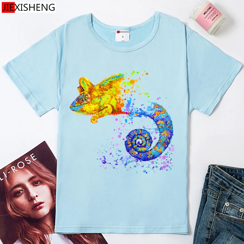 Женские повседневные футболки, летние футболки с принтом ящерицы, топы с короткими рукавами и круглым вырезом