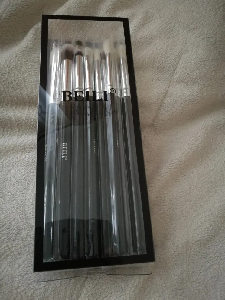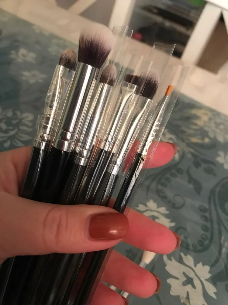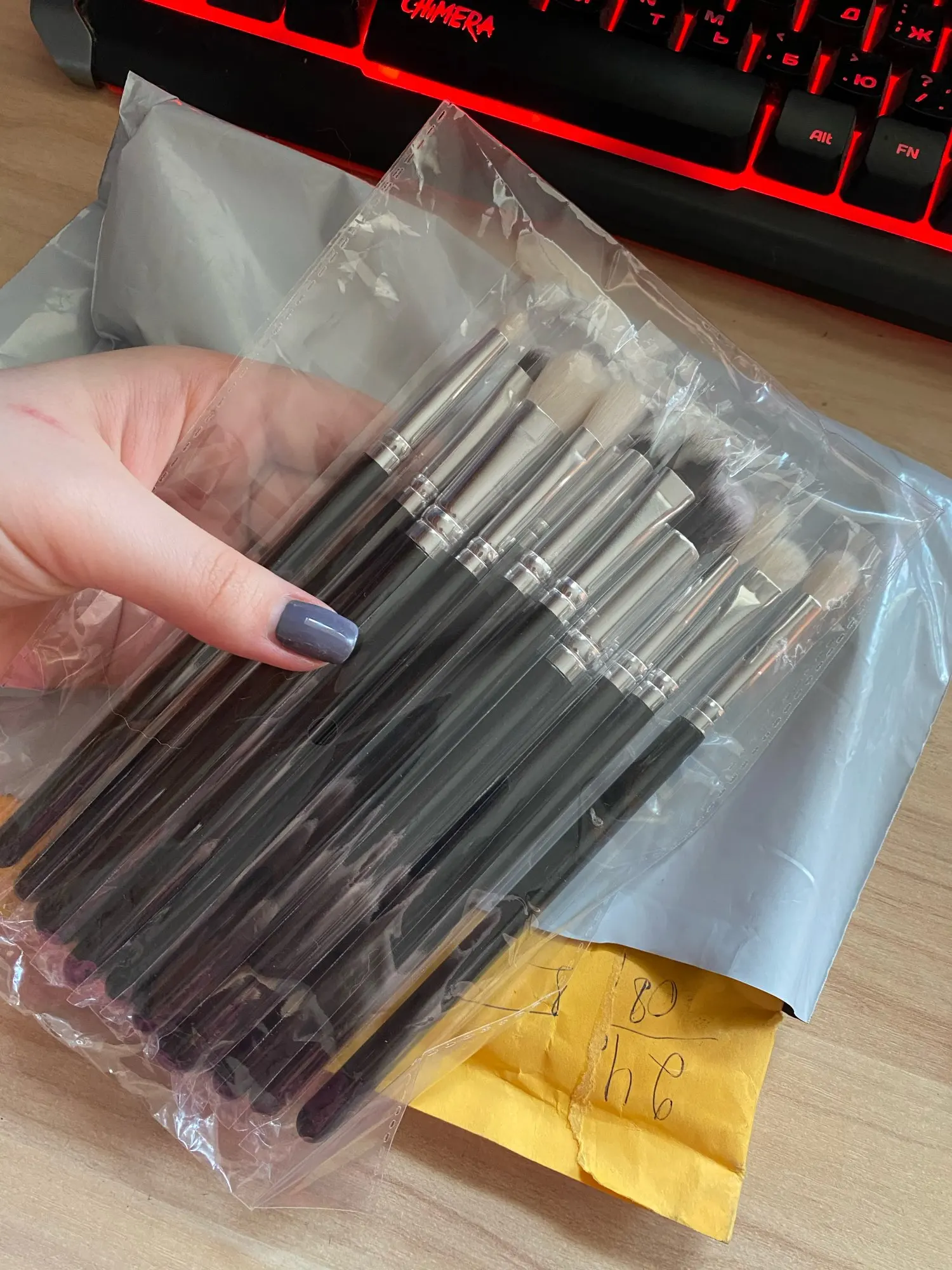 Купила по рекомендации Марины Лакшес. Кисти пришли довольно быстро, недели за три, в пункт выдачи в Пятёрочке. Были в хорошем состоянии, запаха не присутствовало, надписи присутствуют. Кисти с белым ворсом превосходно тушуют тени. Они же распушились немного после первого мытья. Синтетические в порядке, отлично работают с кремовыми продуктами. Очень довольна набором.
