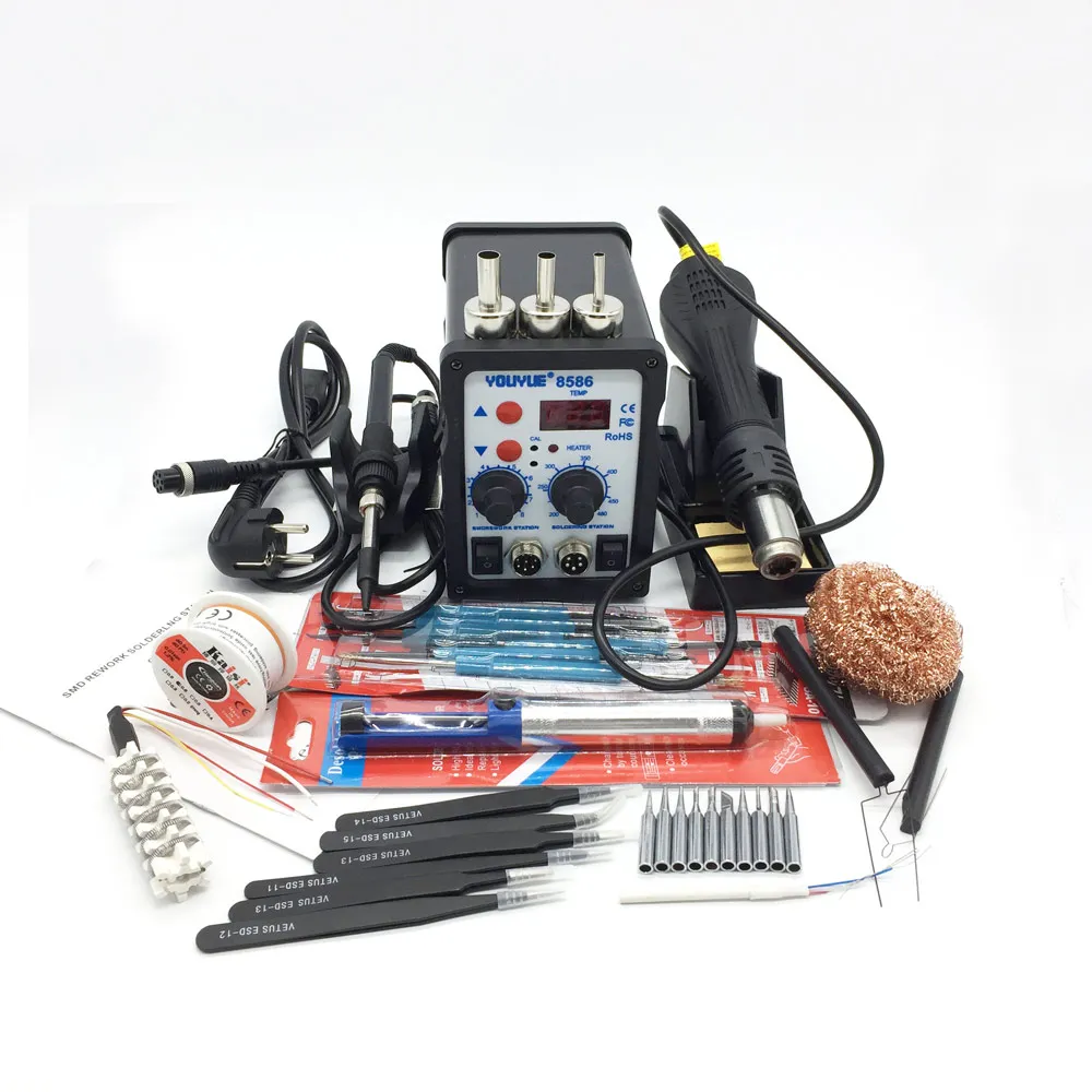 * 1x8586 2 в 1 паяльная станция* 1x ручка для пистолета горячего воздуха* 1x Подставка для ручки* 3x насадки* 1 железо* 1 железная подставка