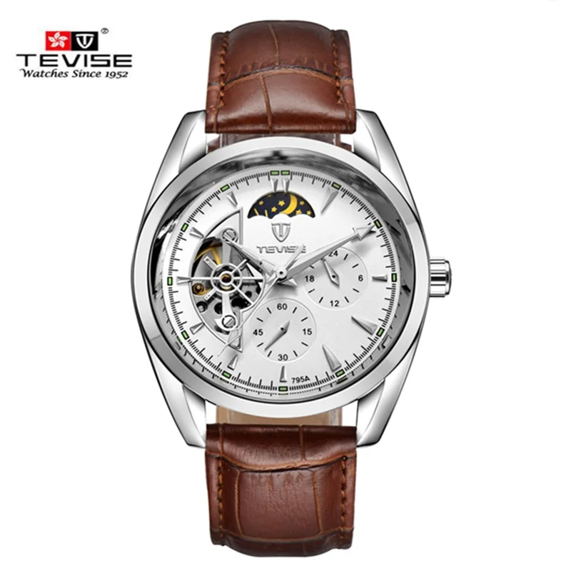 TEVISE автоматические механические мужские часы Tourbillon из водонепроницаемого материала и лунной фазой, мужские часы световой мужской кожаный мужской час 2021
