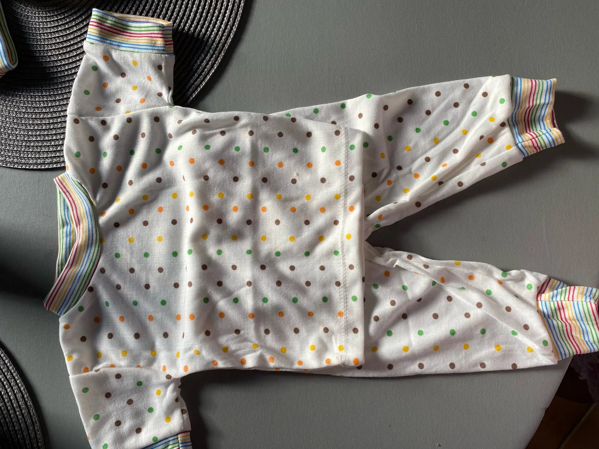 Прошито просто ужасно. Такое впечатление, что шил человек без опыта. Любитель и то лучше прошьет. Везде торчат нитки. Ещё не стирала, не удивлюсь если после стирки просто все разлезется по швам. Отсутствуют ярлыки. Шили видимо в каком-то подвале новички., желающие заработать денег. На штанишкам ещё и пятно тёмное краски. Не уверена, что от стирается. Просто развчарована