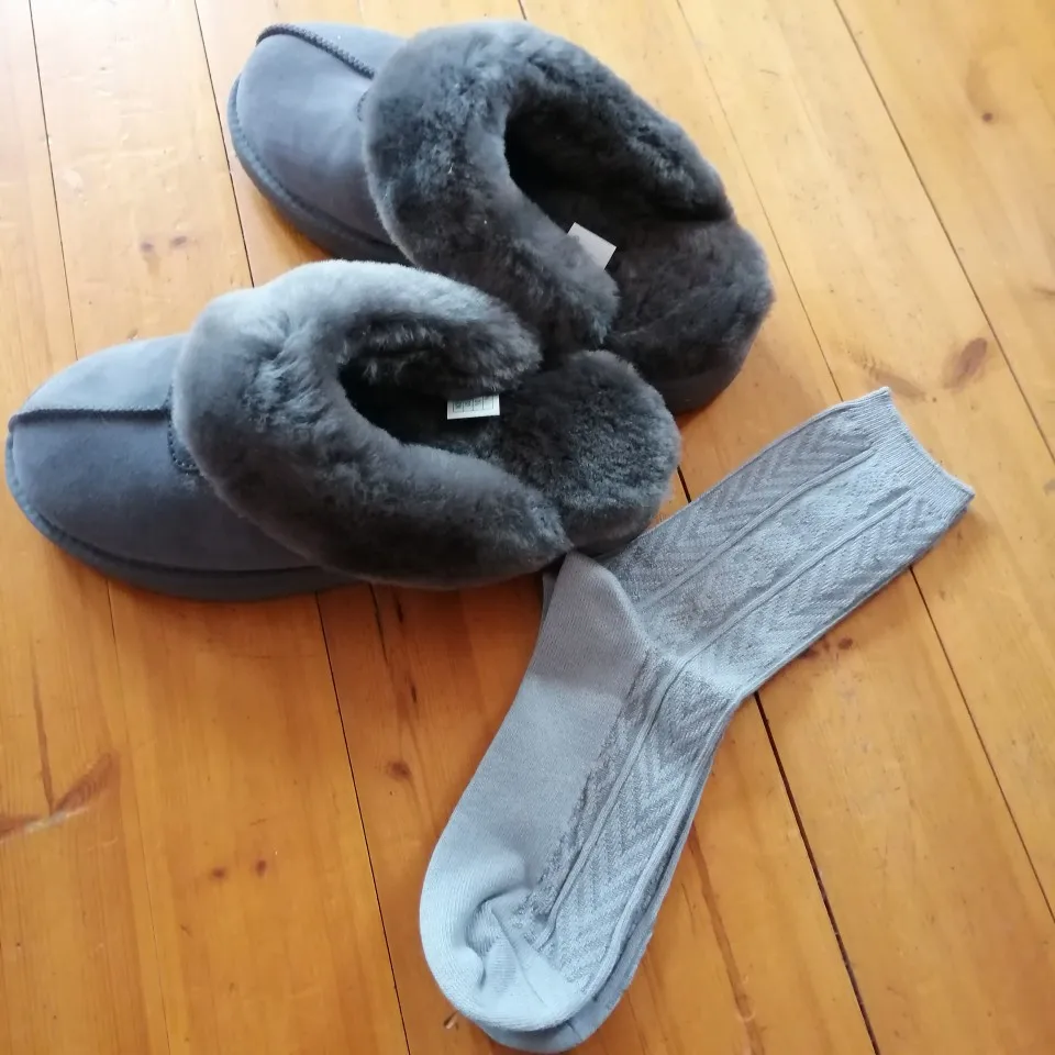 INOE never disappoints. The slippers are lovely and the fit is excellent. Colour is very rich and uniform. An excellent sole on these slippers. Genuine sheep wool. I am most pleased and I will order from INOE again. Other buyers should not hesitate to buy from INOE, an honest and excellent company. Thank you also, for your thoughtfulness in sending a pair of socks.
