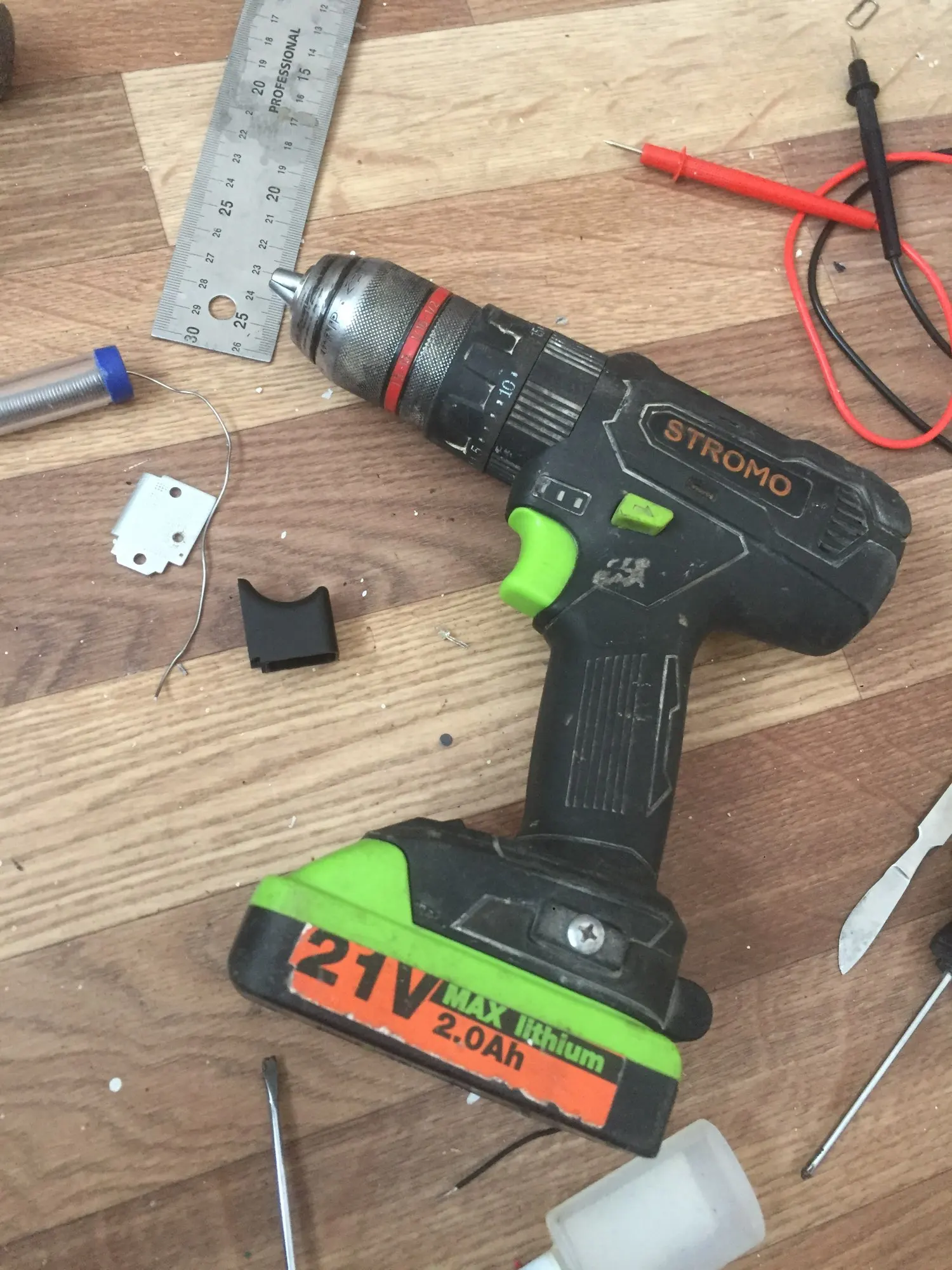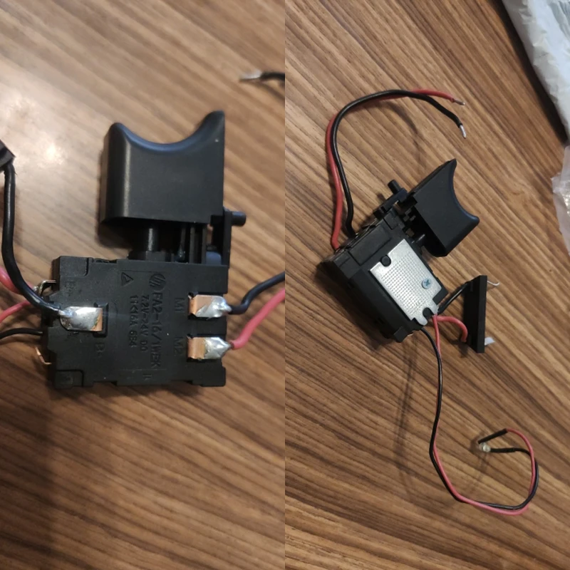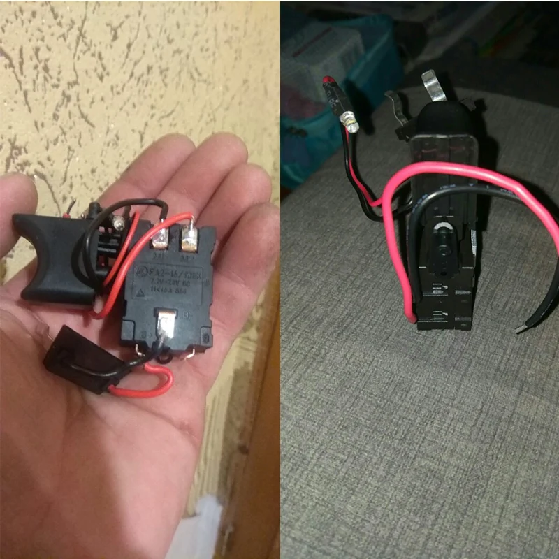 Доставка в Саратов прошла за 9 дней! Кнопка вставлена в ударную аккумуляторную дрель stern 24 v, 2008 года. Работает! Пришлось ее приклеить на термо клей, так как курок у кнопки по высоте меньше, чем родной был, и по длине курок пришлось укоротить на 3 мм. На холостых все работает, в реальной работе пока не проверял. Ну и приятным бонусом оказалась подсветка, правда пришлось провода к светодиоду нарастить и дырочку под него просверлить.
