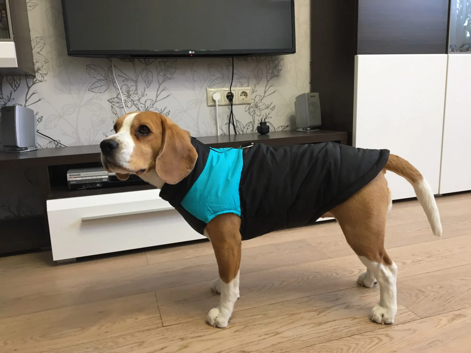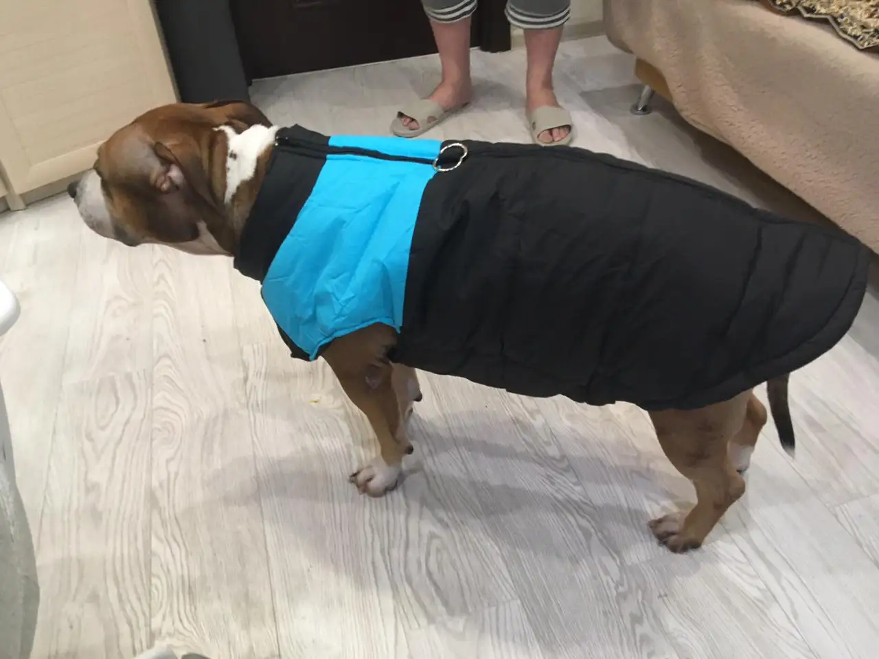 Жилетка сшита очень качественно. Но синтепон в один слой, так что она тонковата, за это сняла одну звезду. Вероятно, в силу телосложения моей собаки (талия 54см, грудь 72 см) размер 5xl в груди оказался как раз, а в талии великоват. Воспользовалась советом в одном из отзывов и вставила в нагрудную часть круглую резинку с фиксаторами так, чтобы можно было регулировать натяжение в талии. В целом товар и магазин могу порекомендовать. Спасибо!