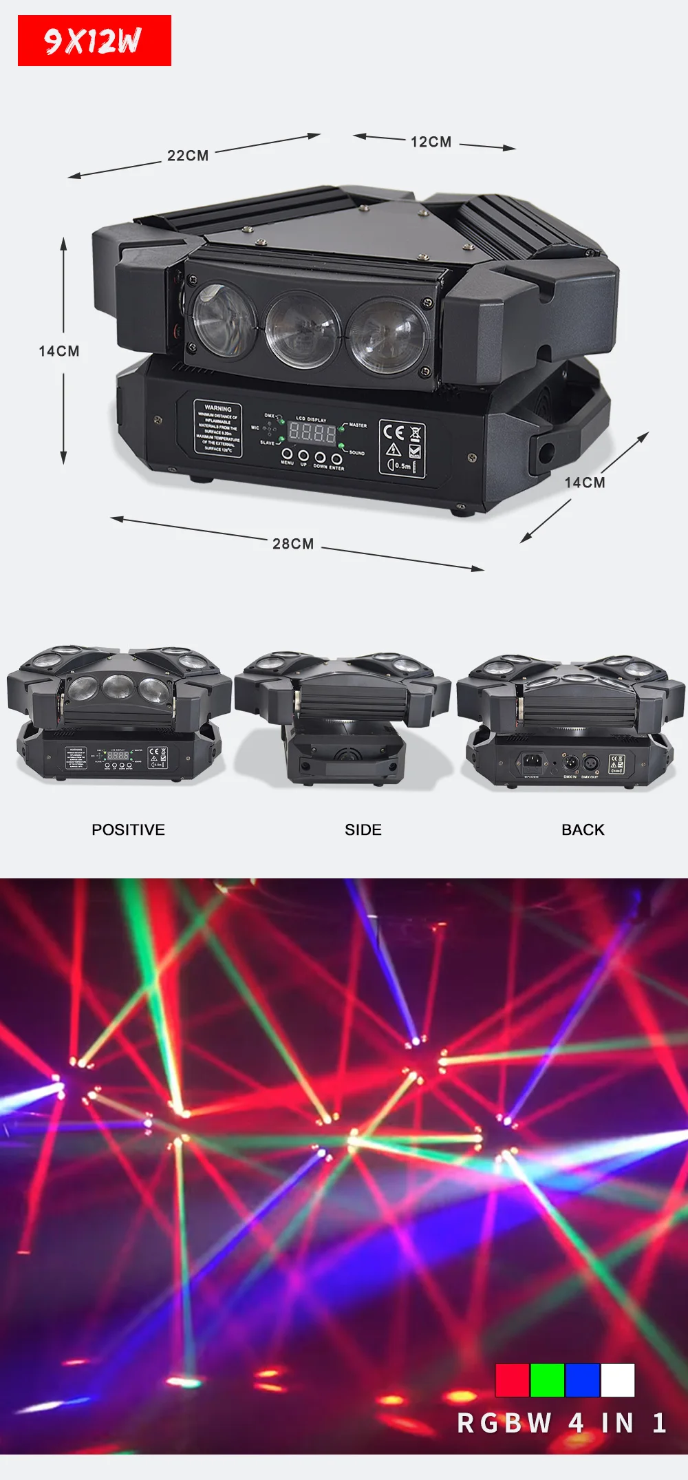 Характеристики:-Уникальный приспособление освещения с быстрым подметальная узкие балки в сочетании с 3x3 зоны светодиодный chase-9x12 ватт RGBW 4в1 светодиодов-С 4 кнопками DMX светодиодный Дисплей-3 режима работы: DMX контроллер, Master/Slave & Sound Active-3 режима канала DMX: 9/16/48-Протокол DMX-512-Электронное Затемнение: 0 - 100%-Включает в себя захватывающие звуковые активированные встроенные программы-Светодиодный импульсный и стробоскопический эффект-60 - 150 градусов наклон от Гладкий Степпер моторов-Очень длительный срок службы (50000 hr. Номинальное число)-Угол луча: 4 градуса-Работает очень круто! -Нет циклов работы! -Бегать всю ночь!-Включает в себя Омега скобы быстрого замка-Крепление на стене, ферменной конструкции или установка на земле-Включение/выключение питания на задней и задней цепях (до 5 @ 120 в и 9 @ 230 В)-Максимальная потребляемая мощность: 140 Вт-Мульти-Рабочее напряжение: AC 100-240V 50/60Hz-Мощность твист-Размеры (ДхШхВ): 458x423x186 мм-Вес: 10,6 кг