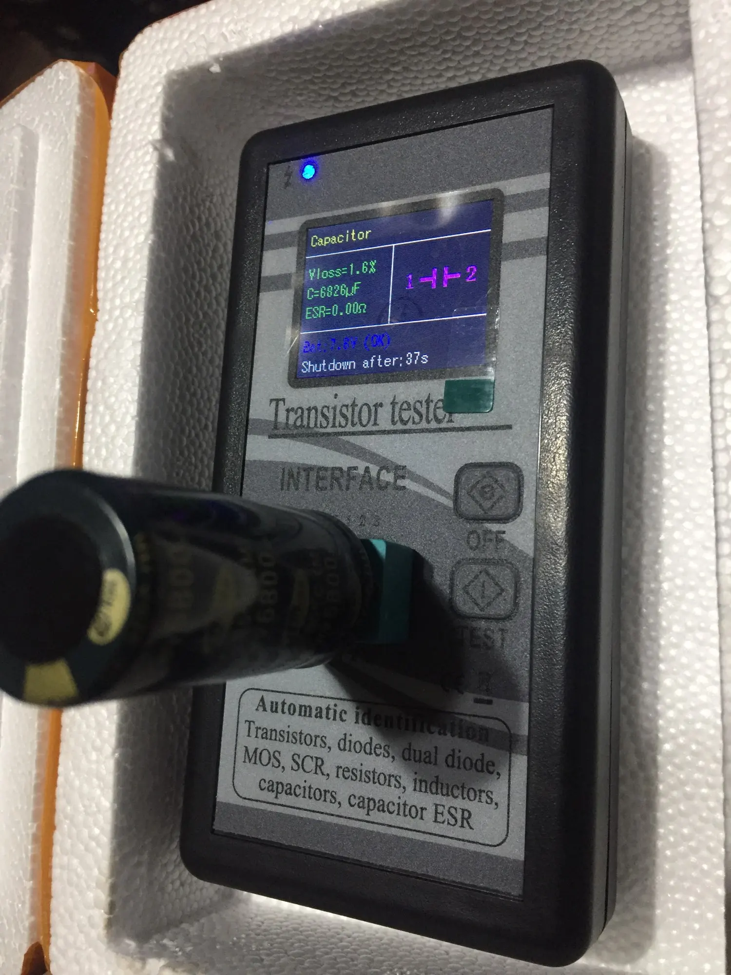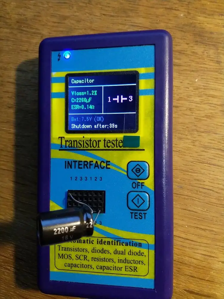 Хорошо упаковано, пришел в течение 16 дней в Японию. Протестировано новым аккумулятором 9В, мой мультиметр показывает 9,6 В, этот Тестер показывает 7,5 В. Протестированный абсолютно новый конденсатор мкФ-> Тестер показывает допуск 917 мкФ (8.5%), а новый конденсатор 2200 мкФ-> Тестер показывает допуск 2266 мкФ (3.5%). Я думаю, что этот тестер o.k