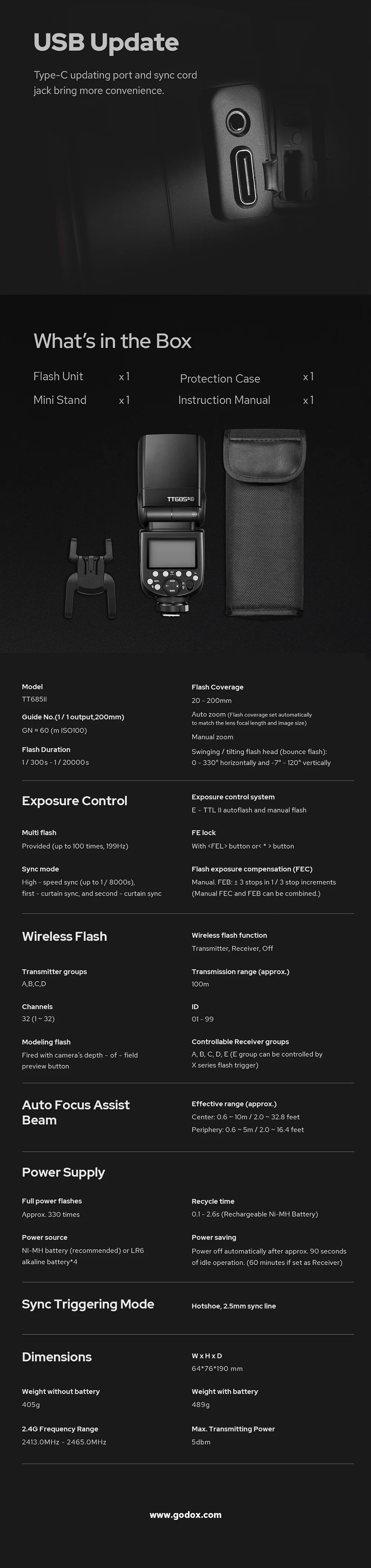 Вспышка Godox TT685II TT685C TT685N TT685S TT685F TT685O TTL HSS для камеры Canon Nikon Sony Fuji Olympus