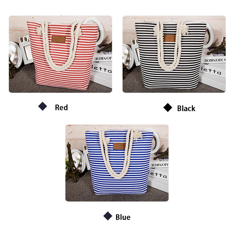 Женская парусиновая пляжная сумка в полоску, большая емкость, женская сумка на молнии, Женская Повседневная сумка для покупок, сумки из полиэстера