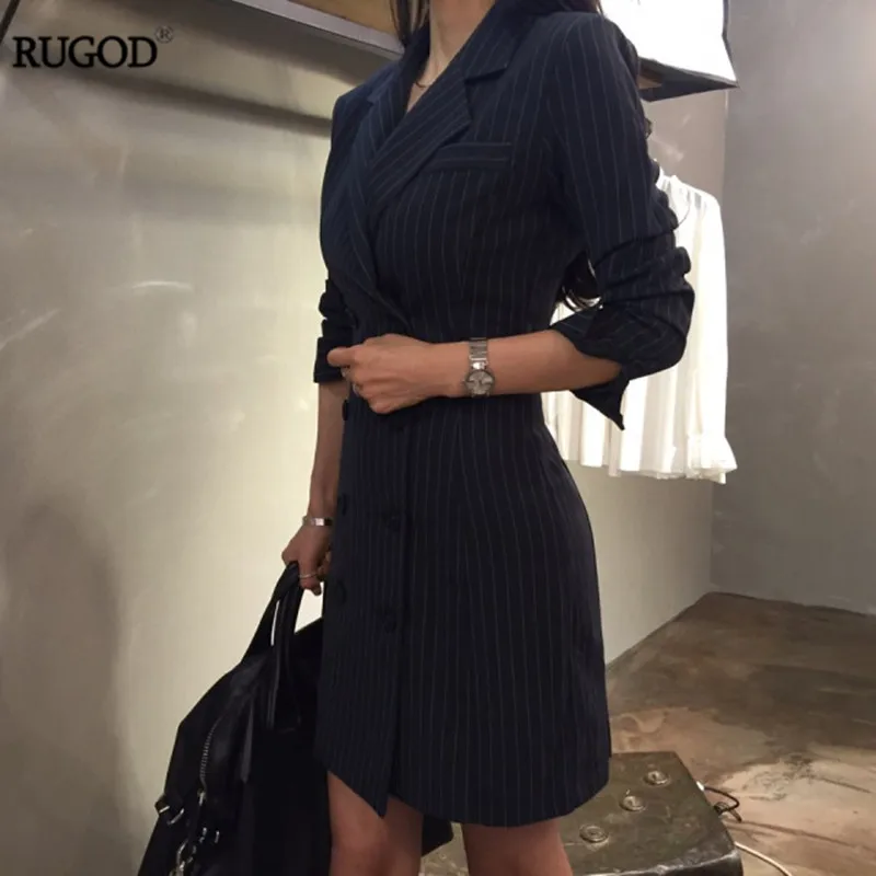 Новинка 2021, офисное женское платье RUGOD с длинным рукавом, женское прямое мини-платье в полоску с отложным воротником и двумя пуговицами
