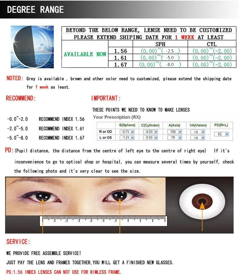 Каждый заказывает объектив, должен оставить сообщение с вашим рецептом, включая ваши измерения PD. На вашем рецепте должно быть несколько символов «+» или «-», это очень важно. Когда вы оставляете свой рецепт, пожалуйста, не отменяйте или не игнорируйте это, когда вы оставляете сообщение. По возможности, было бы лучше сделать фотографию рецепта вашего врача, чтобы избежать каких-либо недоразумений.