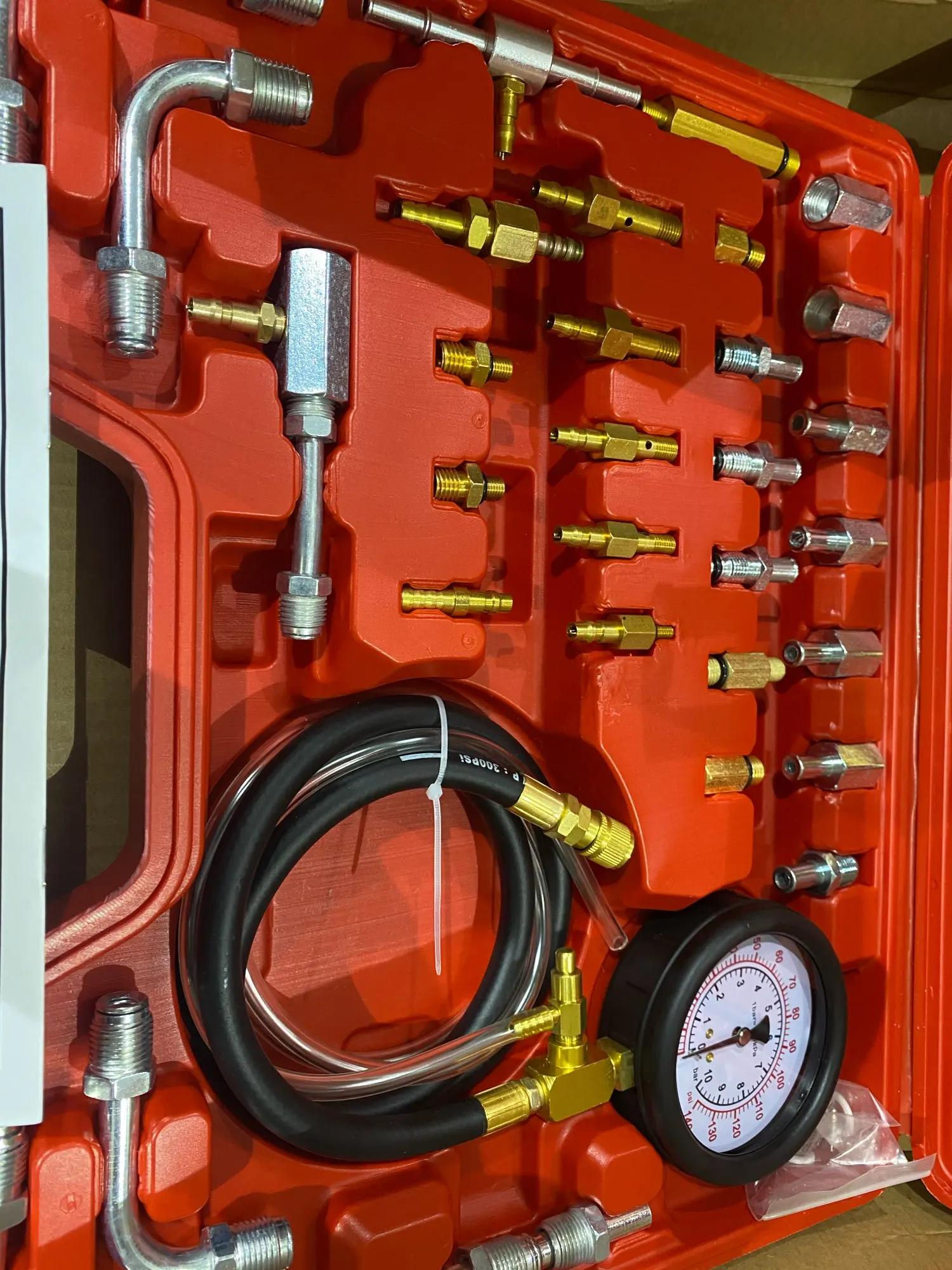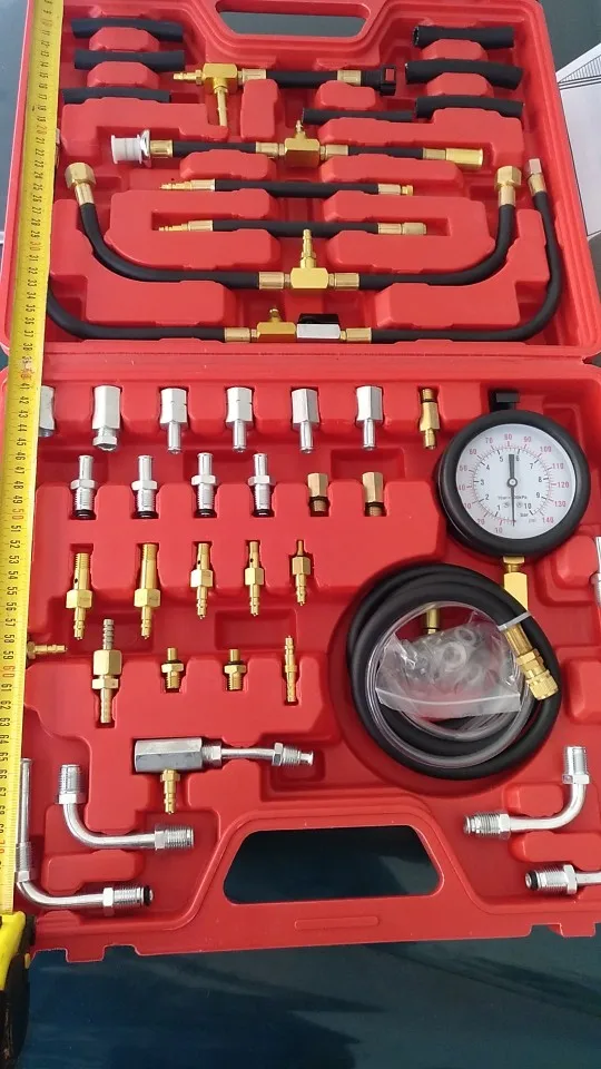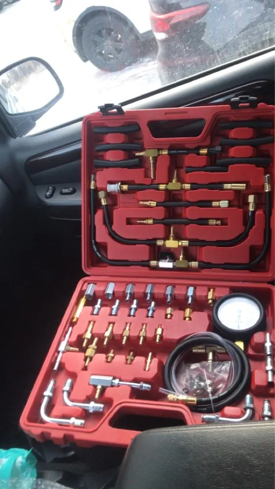 Роскошный манометр, тестер давления впрыска топлива, манометр, система 0-140 psi Уникальный Манометр 3-1/4 "имеет специальное расширение на 1 фунт. Двойной циферблат с шагом для точного считывания, со шкалой 140 фунтов на кв. дюйм/10 бар. Он также имеет предохранительный клапан и 6 футов трубки для безопасного снятия давления и топлива. Также позволяет проверить достаточный расход топлива. Манометр имеет крючок, что позволяет технику иметь обе руки бесплатно Входящие в комплект адаптеры, шланги и фитинги покрывают все системы впрыска топлива и большинство автомобилей и грузовиков по всему миру! Быстрое соединение для экономии времени на конце калибровочного шланга делает быструю и эффективную пару с большинством адаптеров. Набор поставляется в специально разработанном формованном чехле для удобного и организованного хранения.