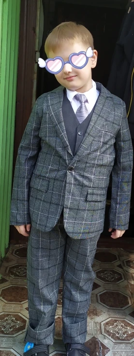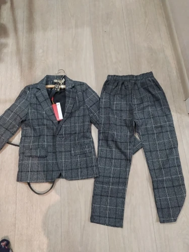 костюм ничего, довольно красивый, ткань тонкая, но приятная, садиться вполне адекватно. маркировка 9Т — 140, а ребенок на фото 130см. штаны без пиджака, увы, как треники выглядят, резинка широкая и бестолковая, носить либо с обманкой, либо как на рекламном фото продавца. на фото продавца заявлено 2 пуговицы, а по факту она одна — это большой минус, ее очень не хватает.