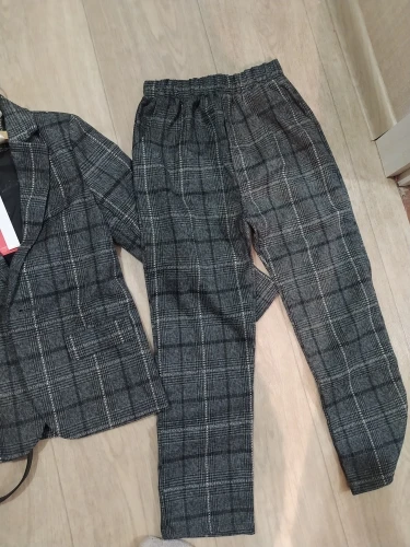 Костюм хороший, брали 13 размер на рост 152 слегка свободноват, но нам так и нужно, будем носить с джинсами с закатаными рукавами. Штаны ещё не придумала будем ли носить, они как спортивные с резинкой, но возможно это тоже прикольно с джемперами.