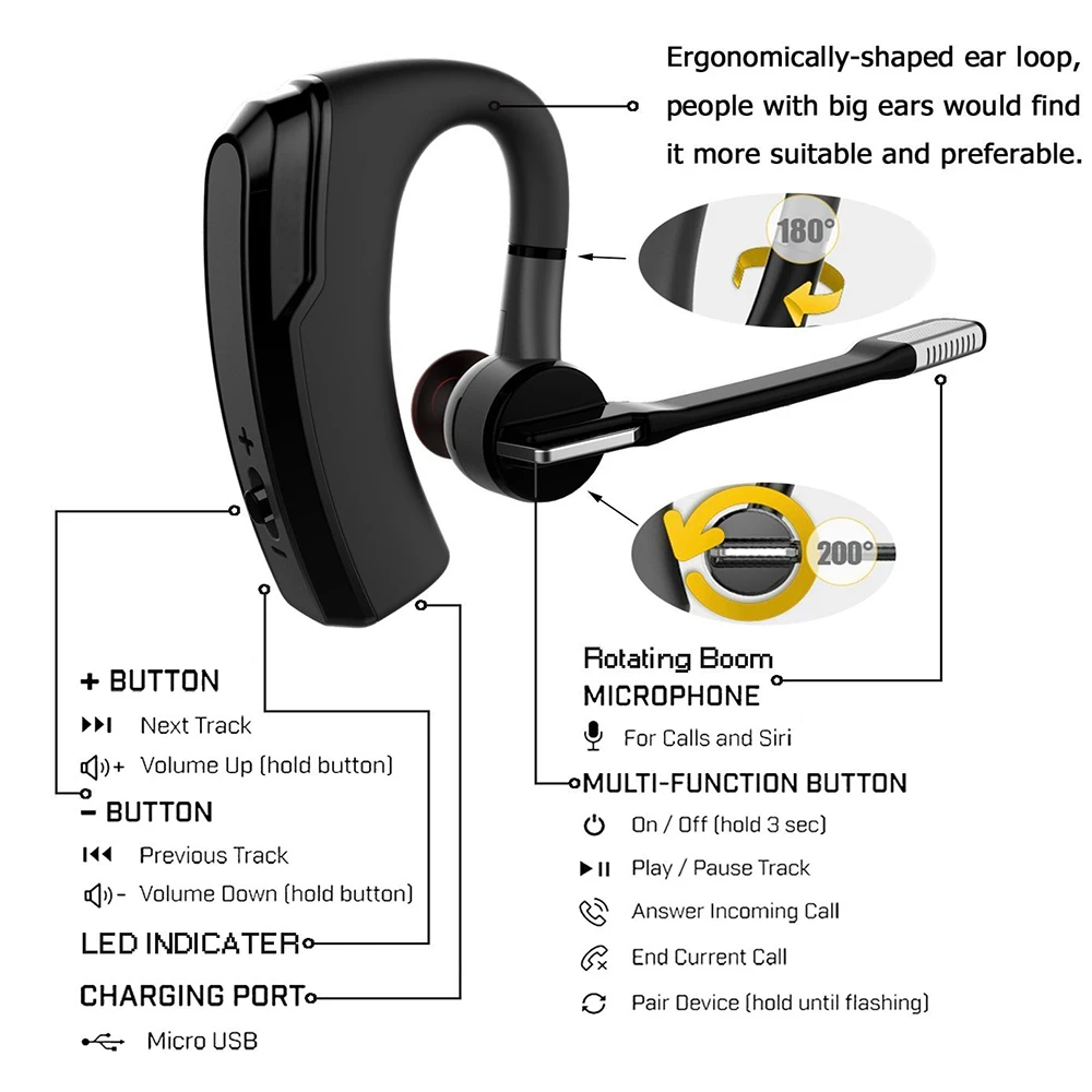 Поворотный рычаг на 180 градусов позволяет регулировать угол и установить эту гарнитуру в правое или левое ухо, что принесет большое удобство пользователю.