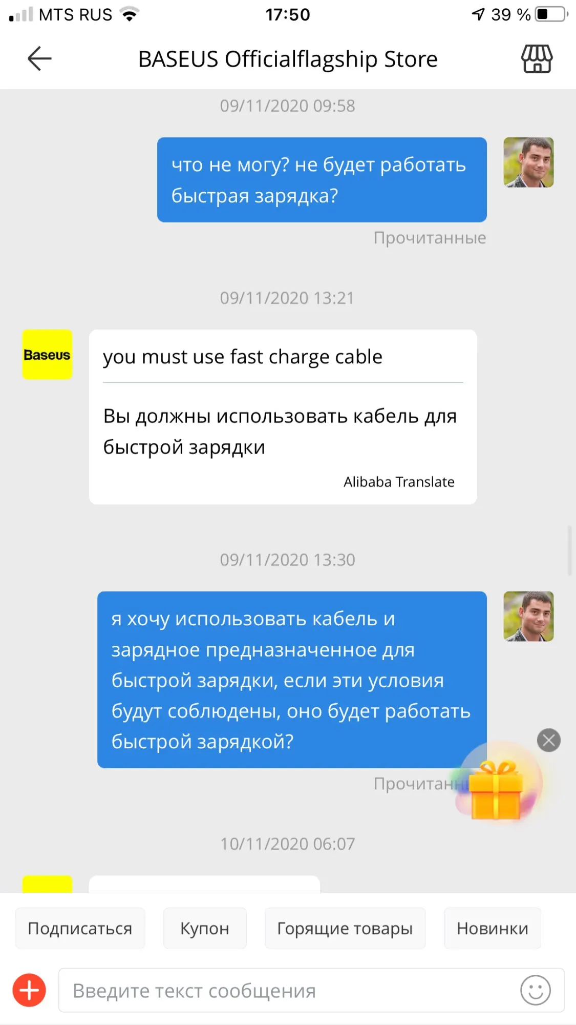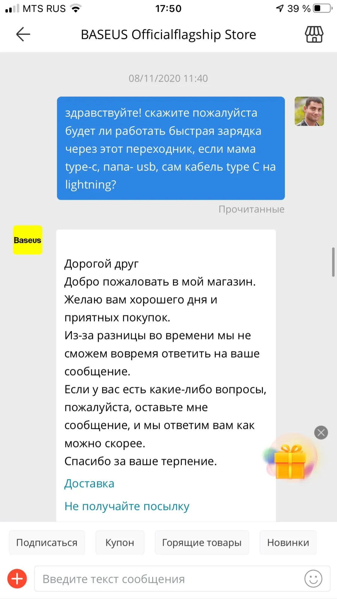 Товар дошел быстро, продавцу за это спасибо. внешне без повреждений, но адаптер не рабочий (((. это не вина продавца, а изготовителя. открыл спор, продавец без проблем вернул деньги. спасибо ему за это. думаю это случайность, в целом товары baseus очень качественные!