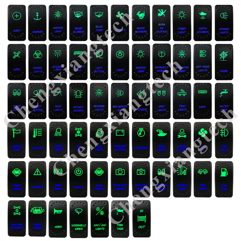 Триммеры, лебедка внутрь или наружу: 7 pin (вкл.) ВЫКЛ. (вкл.) двойной зеленый светодиодный переключатель.Nav/Anc огни, стеклоочиститель: 7 pin on off on dual green led switchРог: 5 pin (вкл.) двойной зеленый светодиодный переключатель