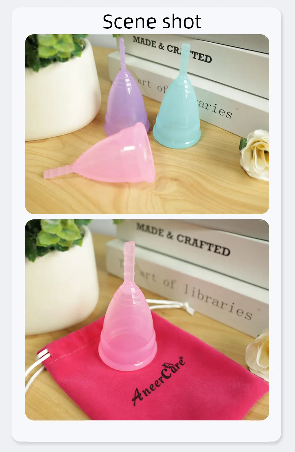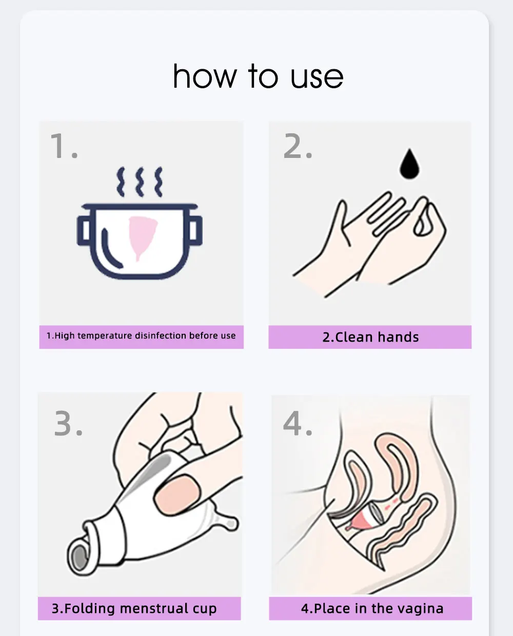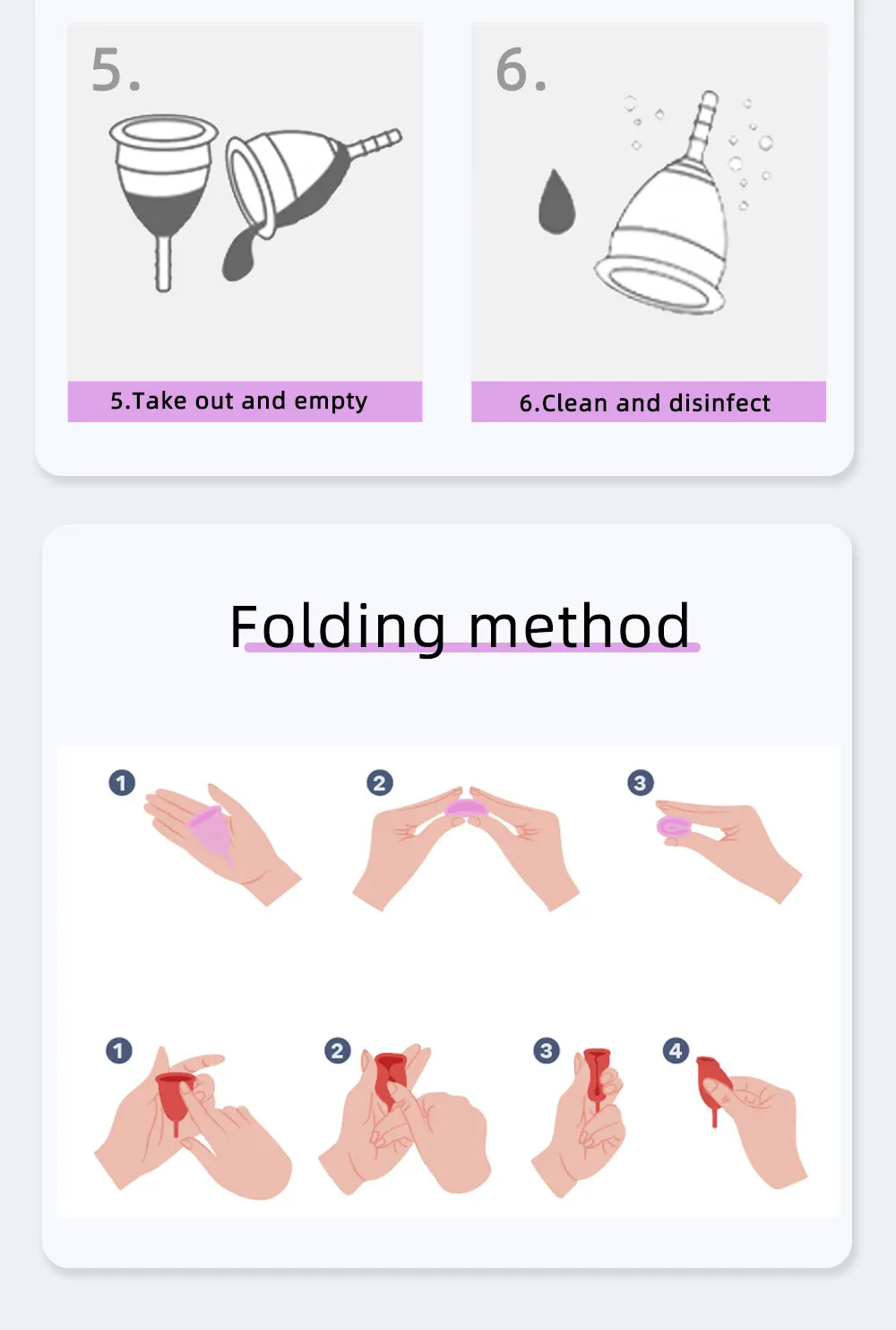 1. Стерилизуйте менструальные чаши при высокой температуре перед использованием2. Чистые руки3. Складная менструальная чаша4. Поместите во влагалище5. Вынуть и опуститьОчистка и дезинфекция