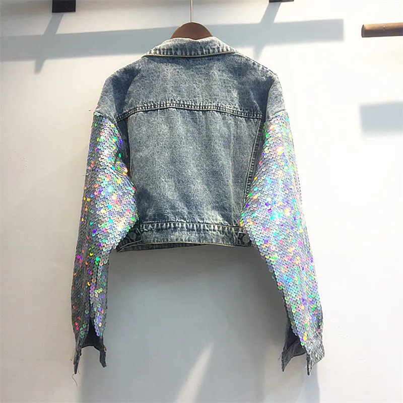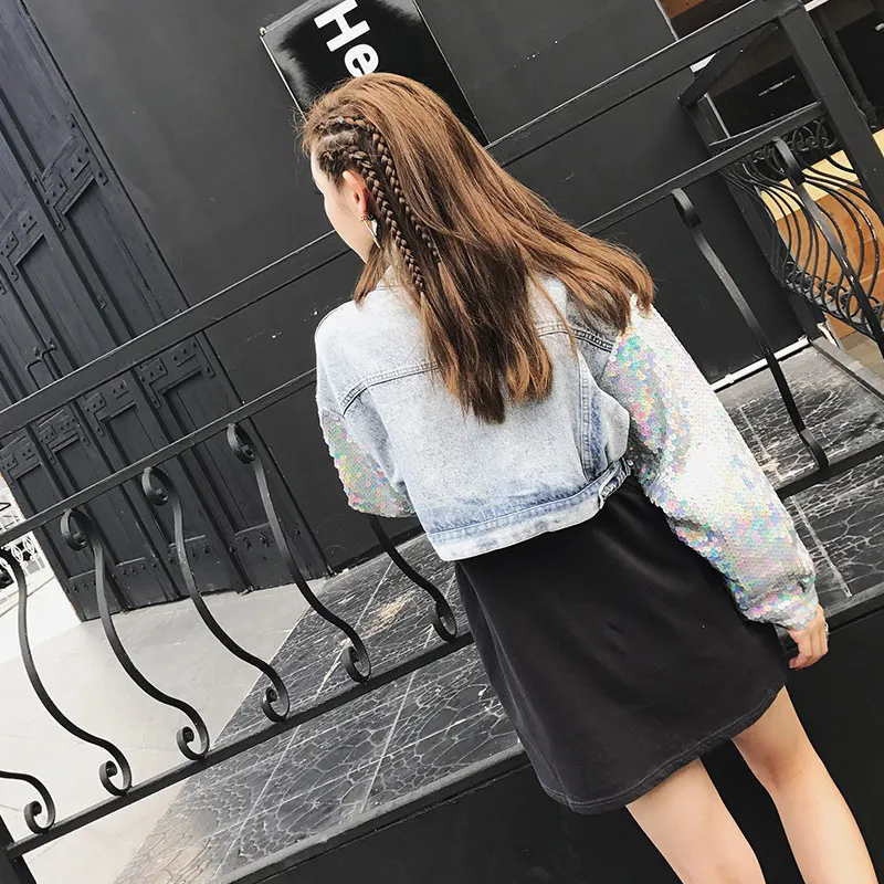 Женская джинсовая куртка с блестками, короткая джинсовая куртка с длинным рукавом и металлической оправой, уличная одежда в стиле панк, осень 2019