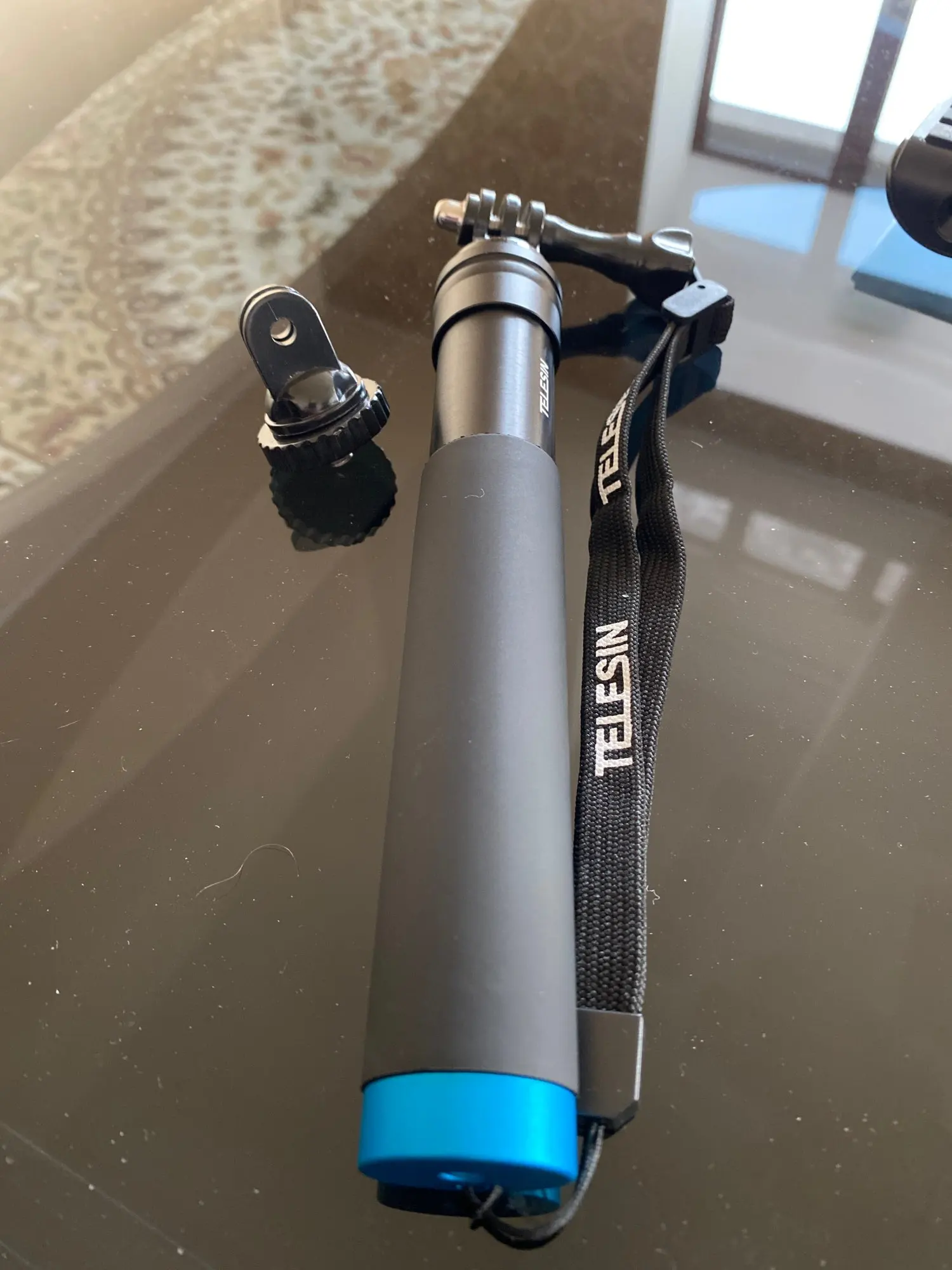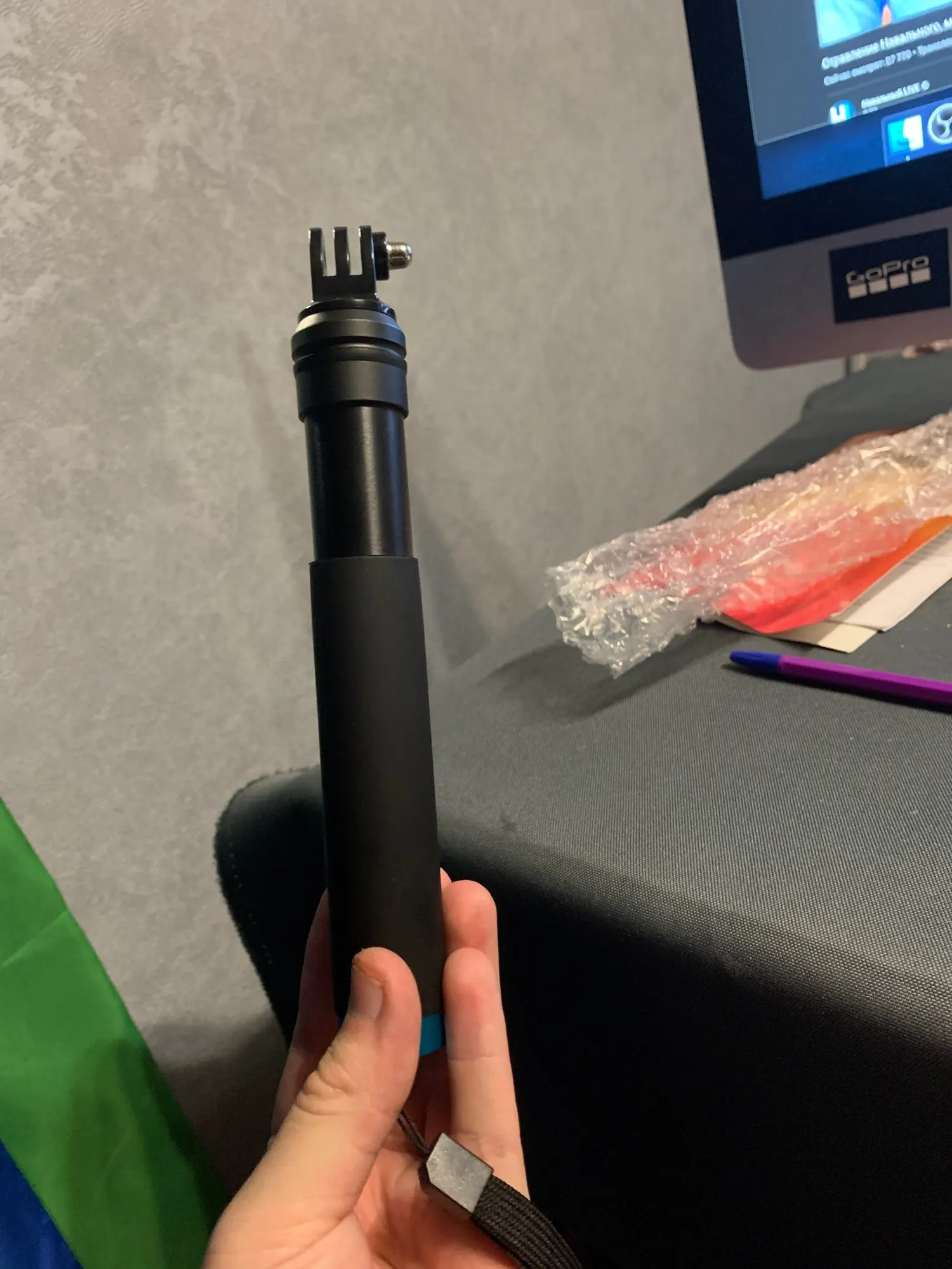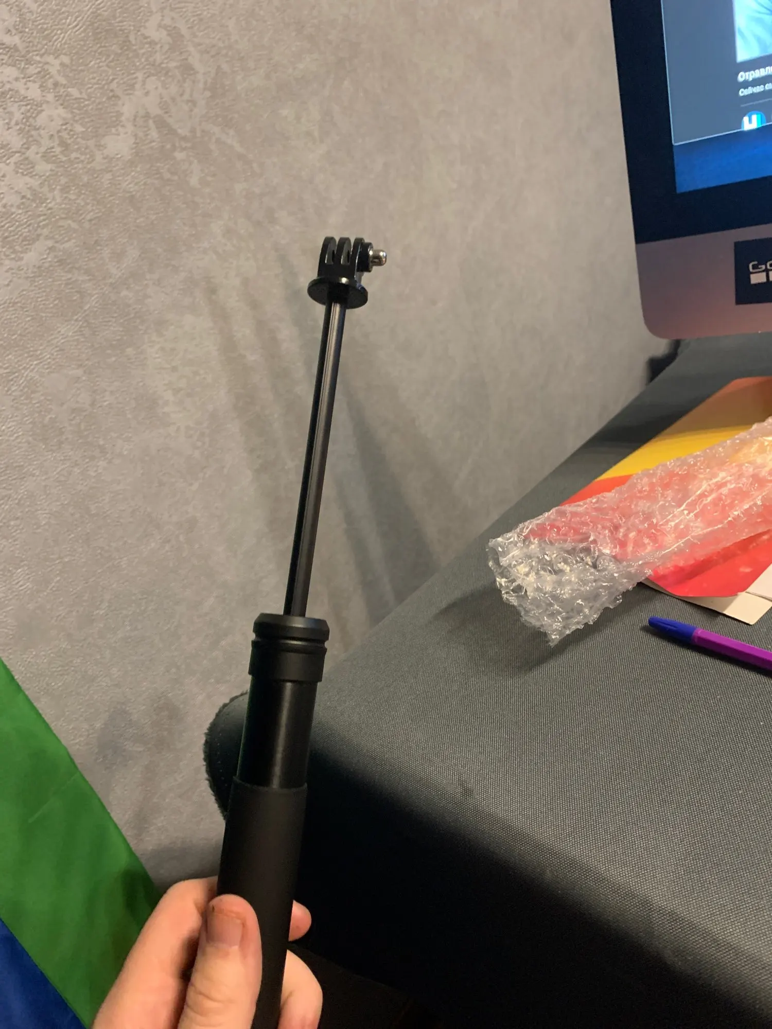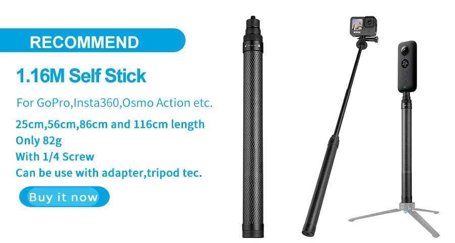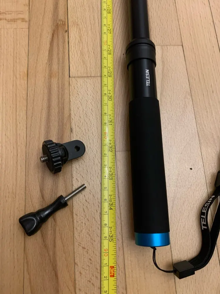 Очень быстрая доставка до Москвы. Раскладывается туговато, но люфтов нет, но думаю разработается. Отлично работает в связке с камерой insta 360 R (камера его полностью маскирует без артефактов) длинны 90 см достаточно для «плоского видео селфи» на сноуборде, вырезанного из 360 градусного видео. В сложенном состоянии вместе с камерой 27 см (помещается в карман для маски сноубордической куртки).