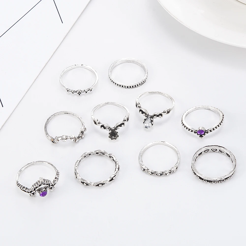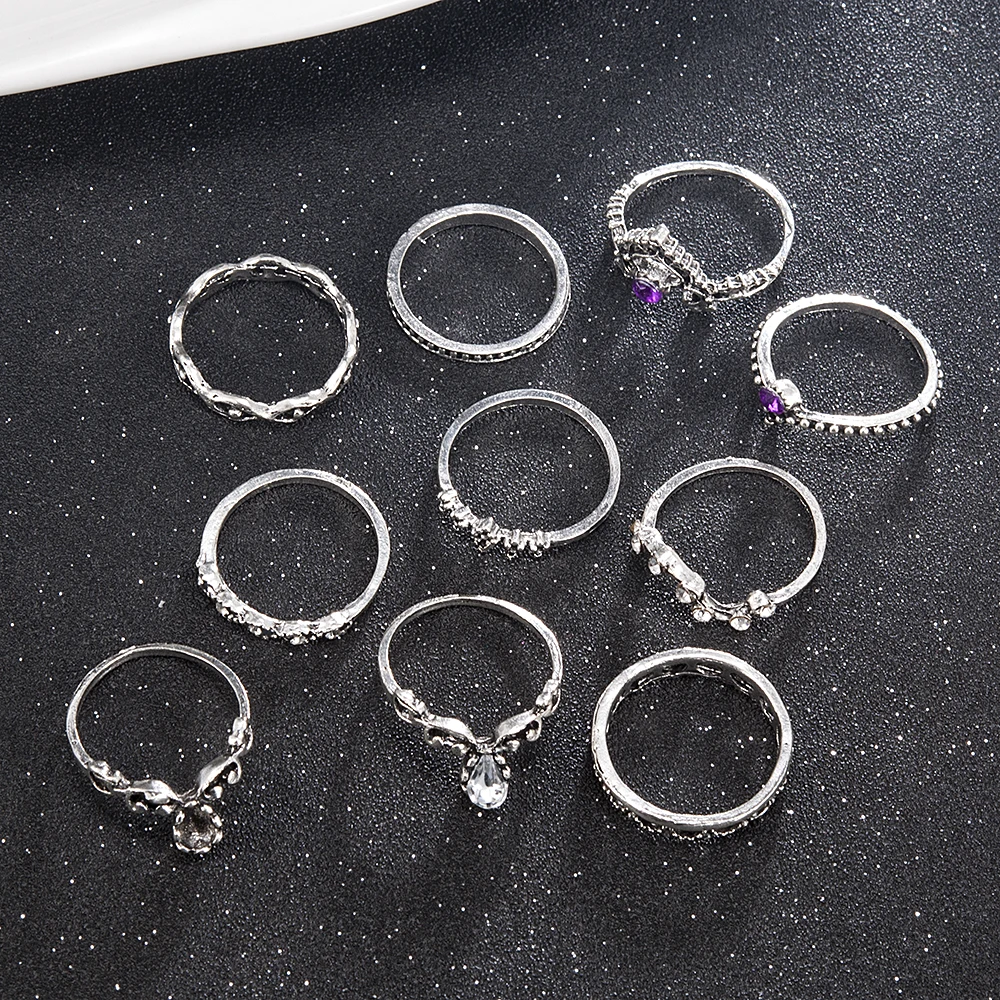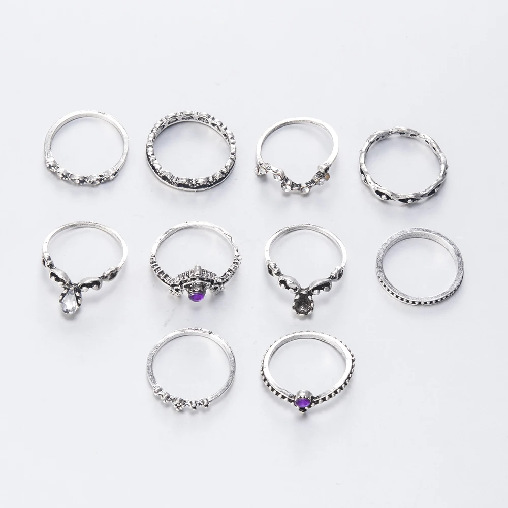 10 шт.компл. ретро хрустальные кольца с короной и костяшками модные ювелирные изделия женские очаровательные серебряные кольца