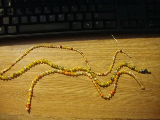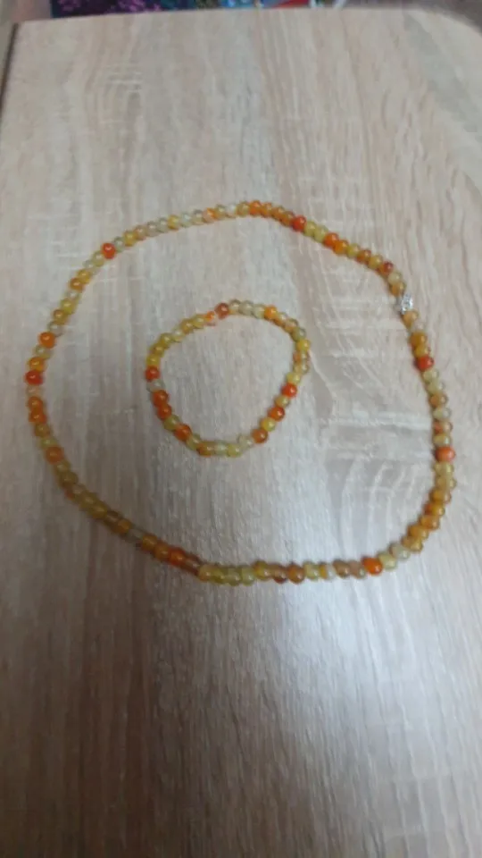 Не такой огненно-яркий, оранжевых бусин всего 5 на нитку, остальные желтые и лимонные.