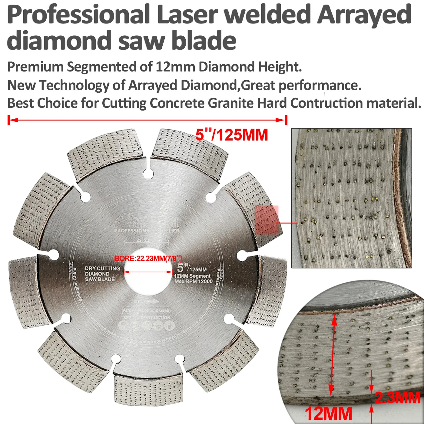 Diameter 5"/125MM, Bore 22.23MM, Diamond height 12MM, Segment thickness 2.3MM