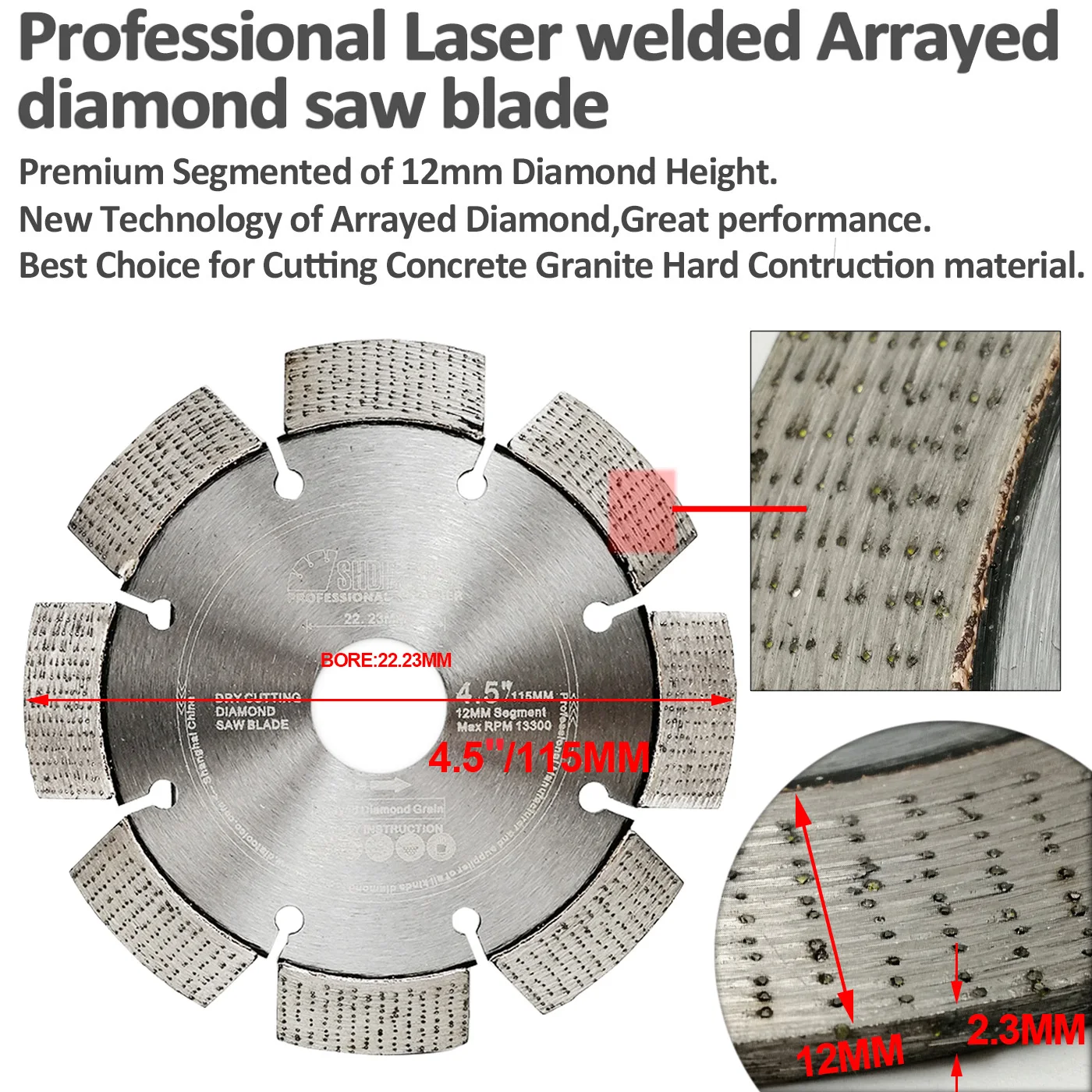 Diameter 4.5"/115MM, Bore 22.23MM, Diamond height 12MM, Segment thickness 2.3MM