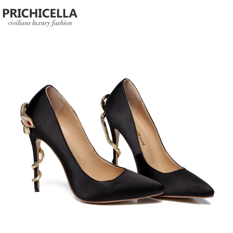 PRICHICELLA атласные золотые туфли на змеином каблуке; Уникальные туфли-лодочки из натуральной кожи с острым носком на высоком каблуке