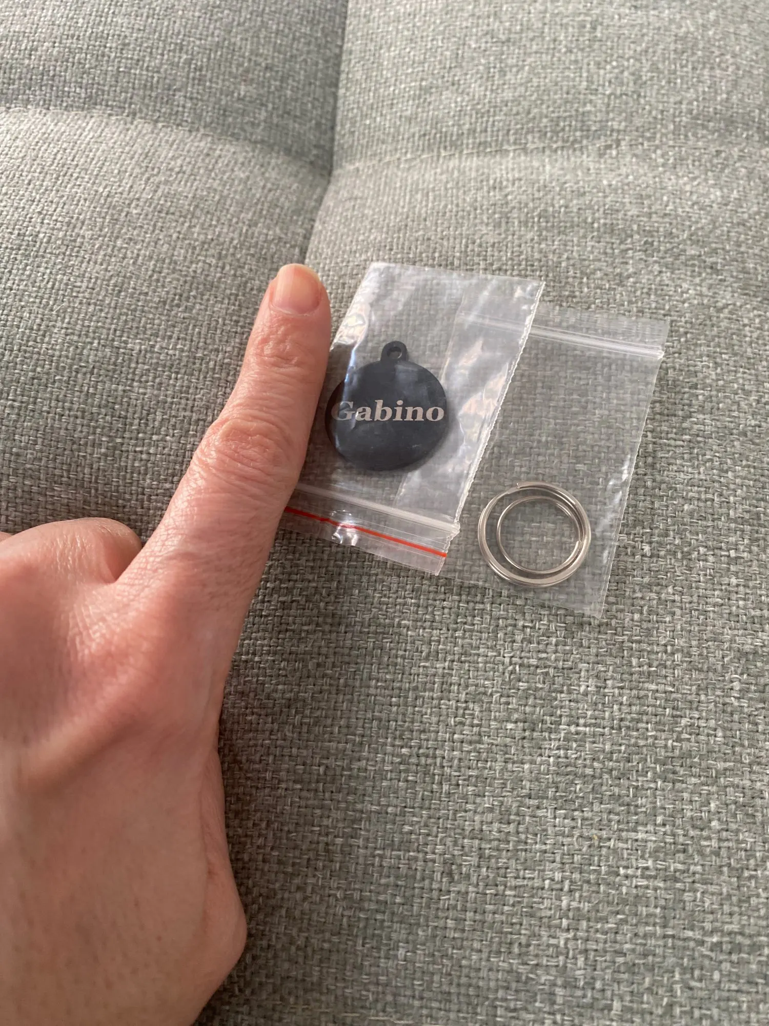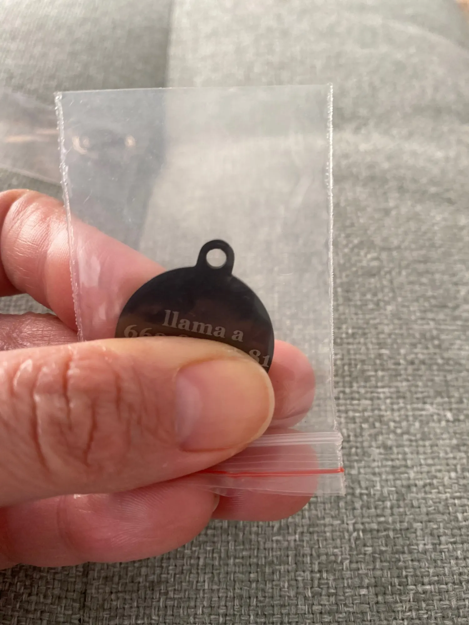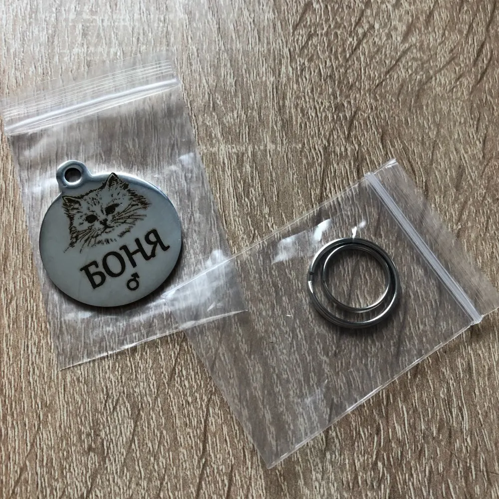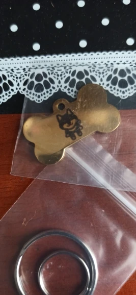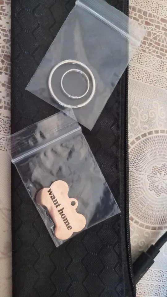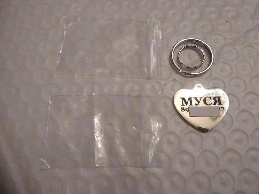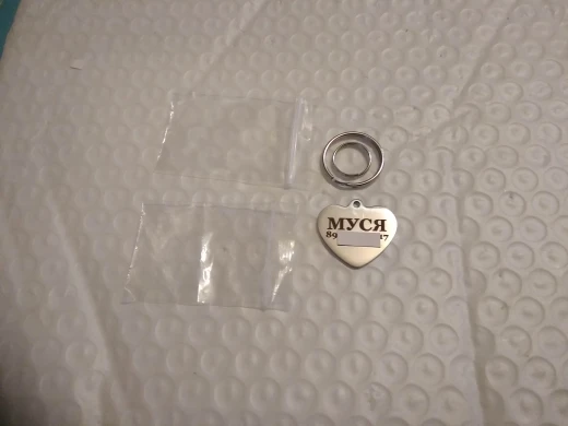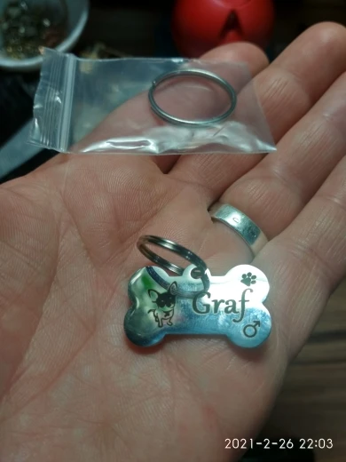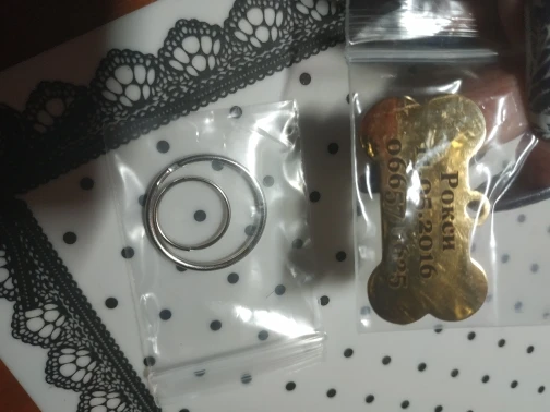 Заказываю адресники у продавца не первый раз, качество отличное, металл толстый, гравировка не стирается. Доставка 2-3 недели до СПб. В комплекте два кольца для крепления, маленькое лучше не использовать, разгибается, а больше отлично держит адресник.