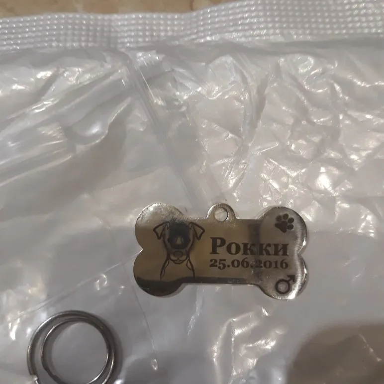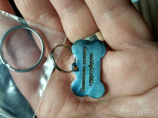 Товар описанию соответствует. Отличная бирка для домашнего питомца, с качественной гравировкой. Доставка три недели в объединенном пакете. Трек отслеживался. Продавца и товар рекомендую.