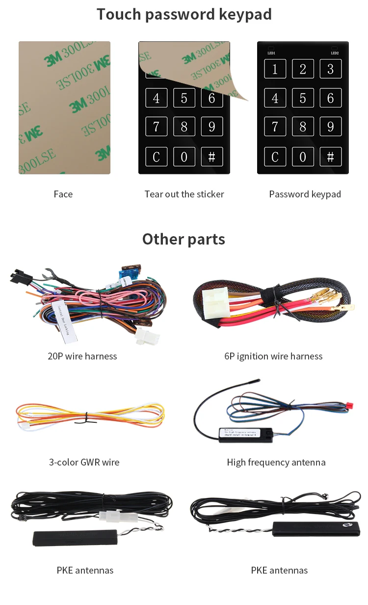 Это интеллектуальная PKE Автомобильная сигнализация с кнопкой запуска двигателя, кнопкой запуска пароля, сенсорной клавиатурой и автоматическим выходом закрытия окна.