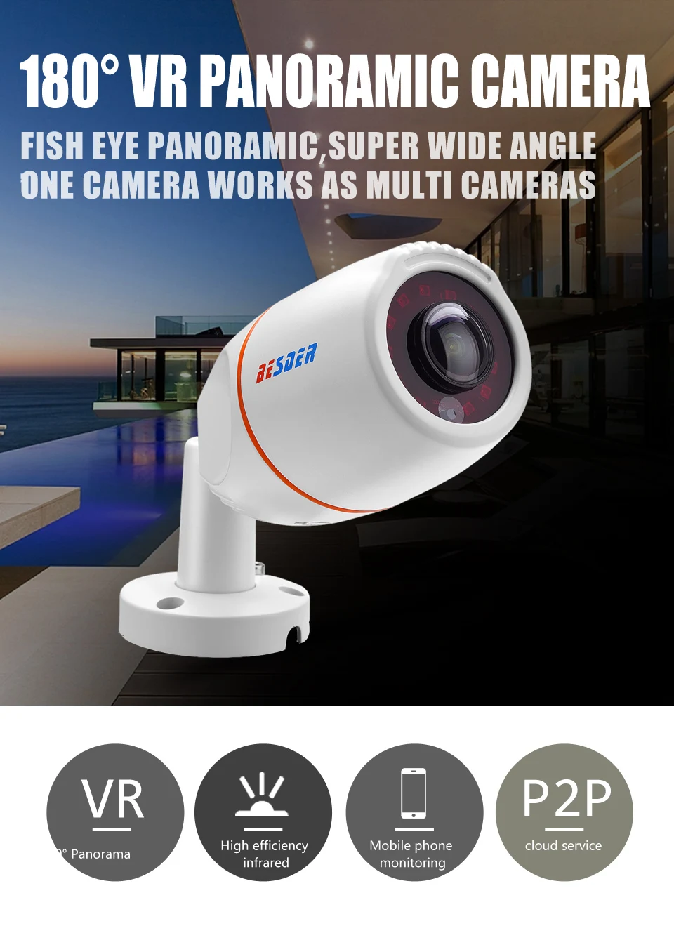 Ip-камера BESDER, 48 В, POE, рыбий глаз, HD 1080P, 1,7 мм, широкий угол обзора 180 градусов, панорамная Антивандальная наружная камера видеонаблюдения