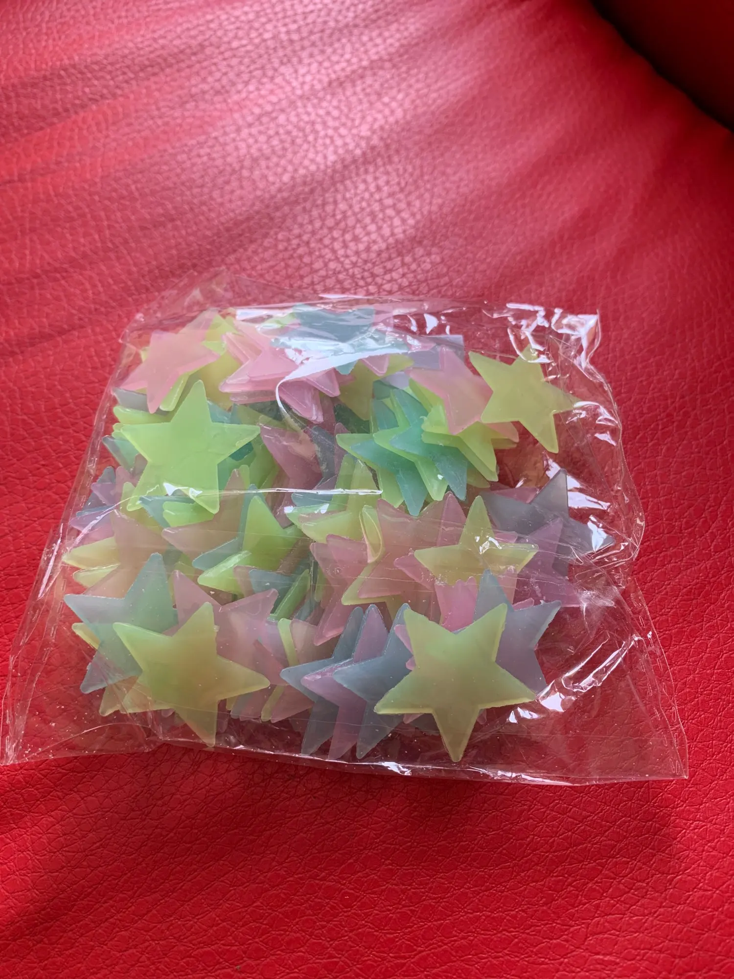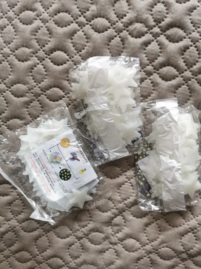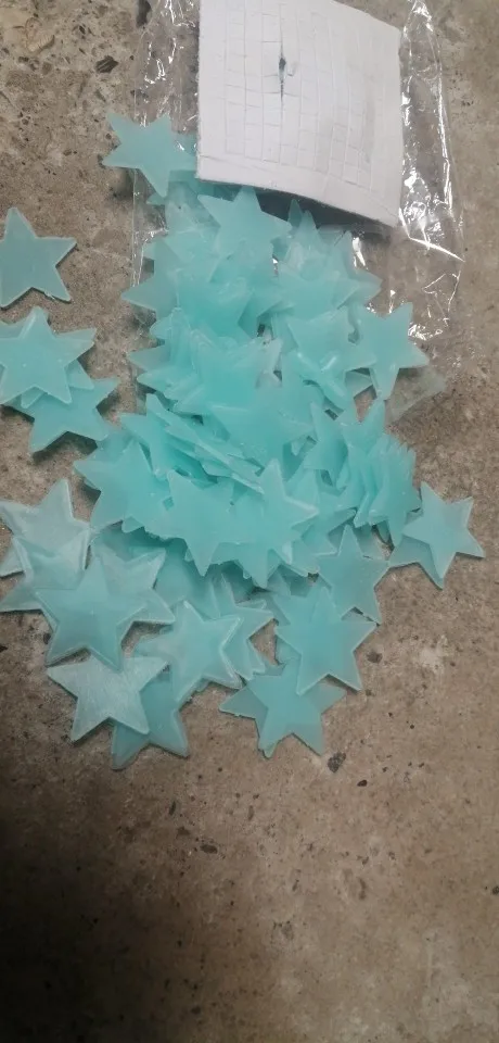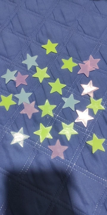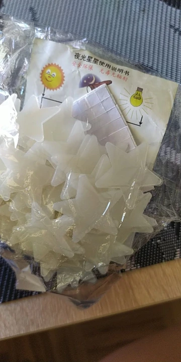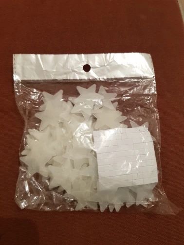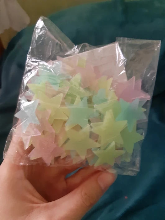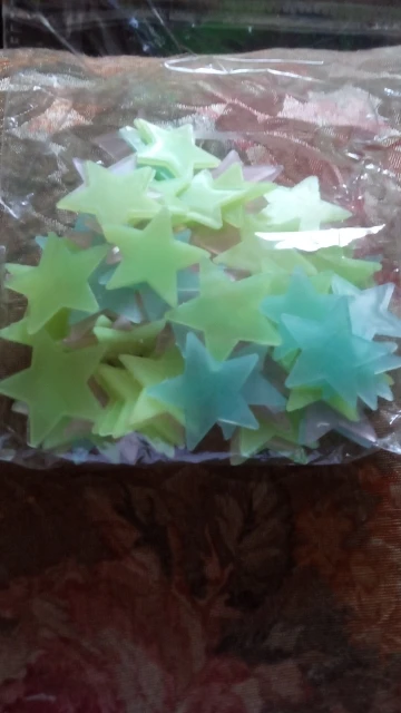 Пришел товар. Звездочки светятся только очень слабенько, в комнате если наклеить то они не светятся после выключения света, на них нужно специально направлять луч света, стоять и светить с фонарика на каждую, и то это не надолго. Так что ради свечения не стоит брать, а так, для детей интересные пластмаски.