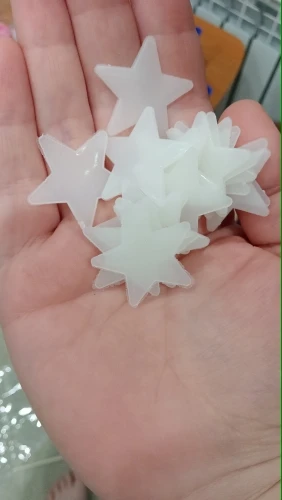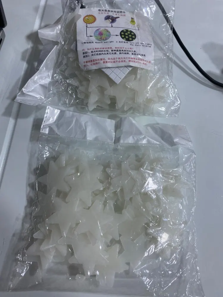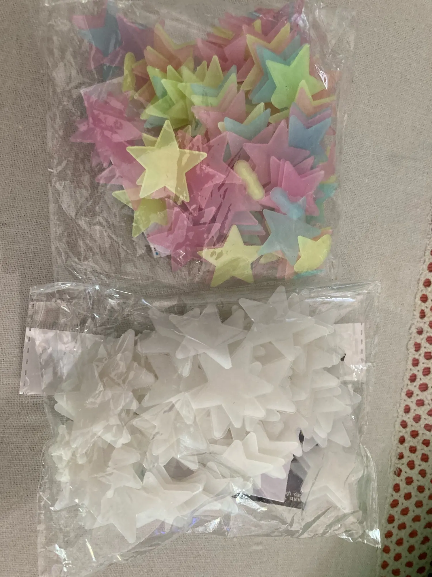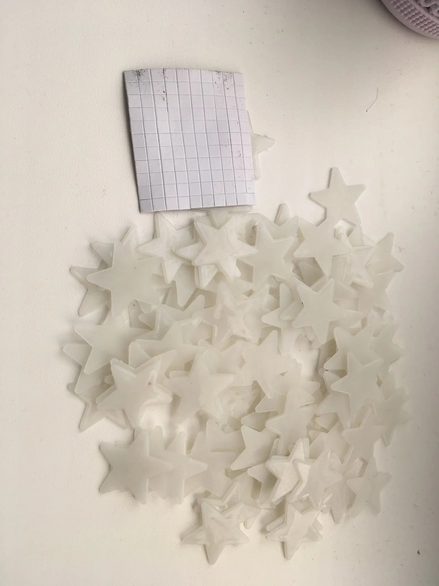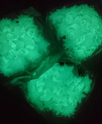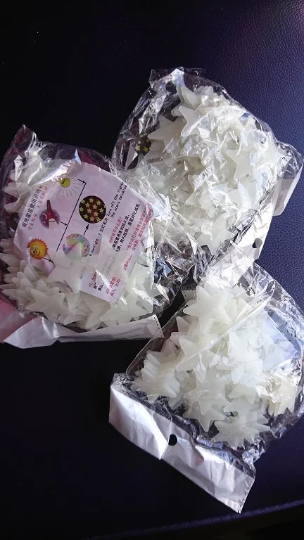 Пришел товар. Звездочки светятся только очень слабенько, в комнате если наклеить то они не светятся после выключения света, на них нужно специально направлять луч света, стоять и светить с фонарика на каждую, и то это не надолго. Так что ради свечения не стоит брать, а так, для детей интересные пластмаски.