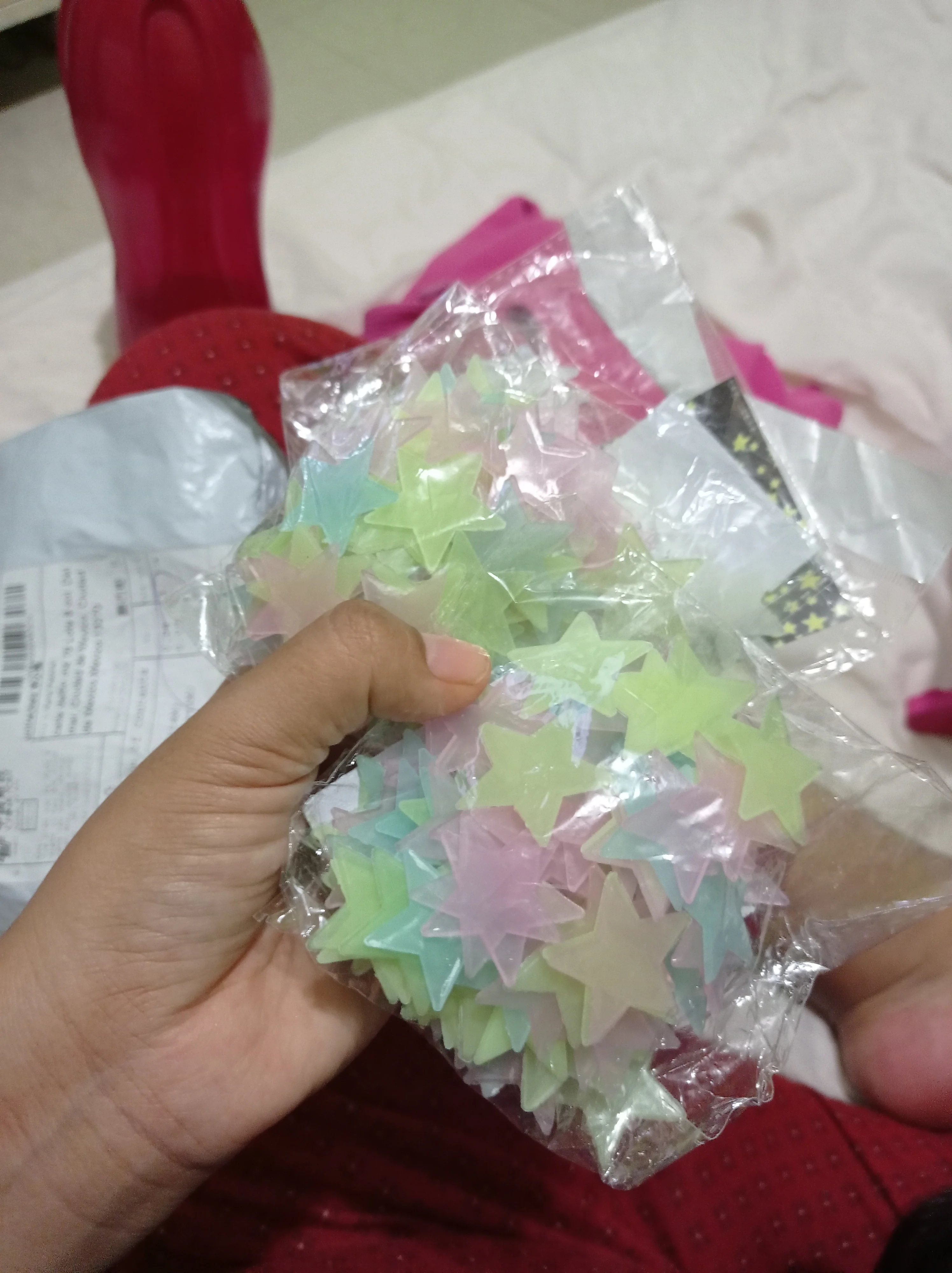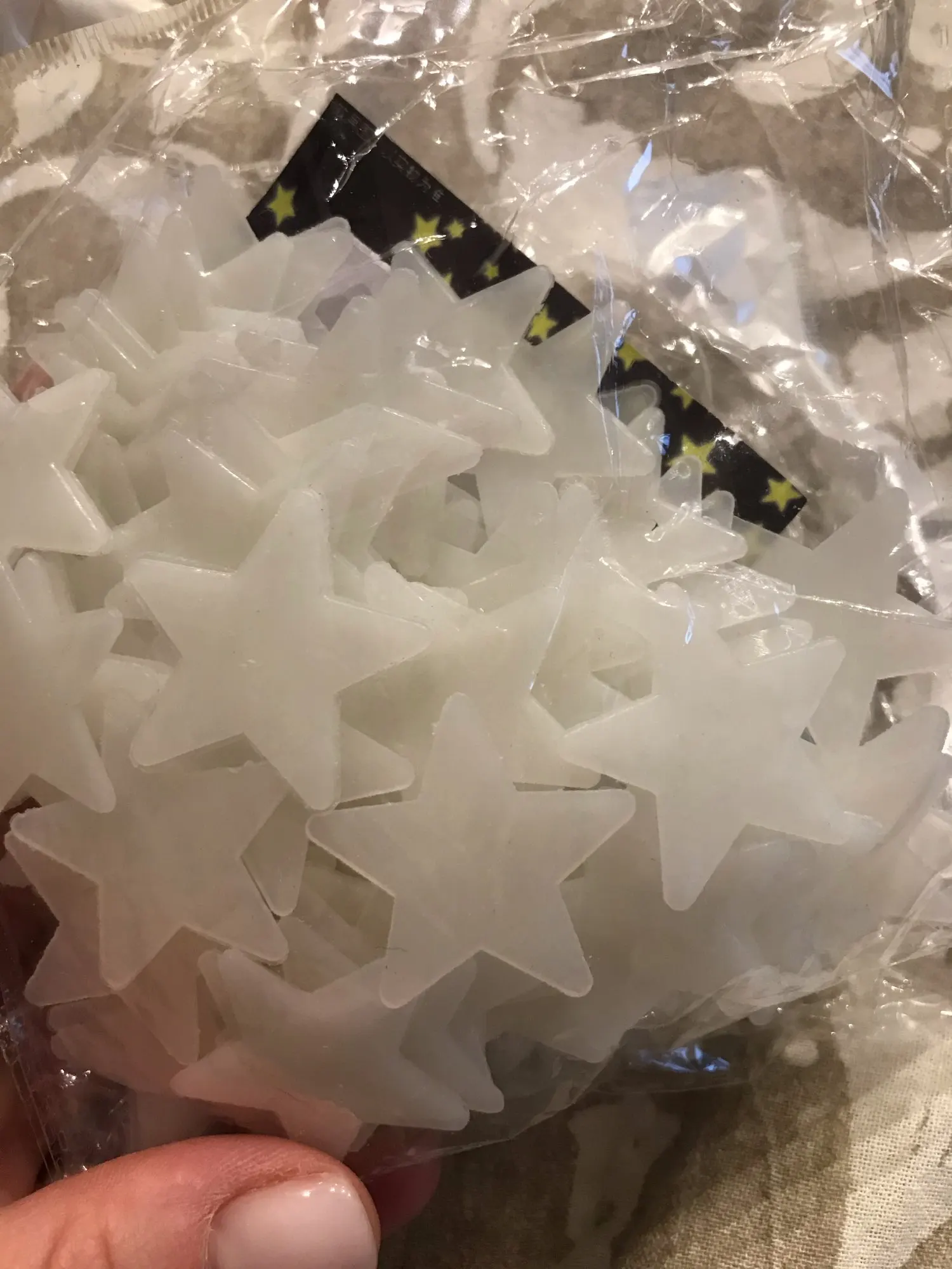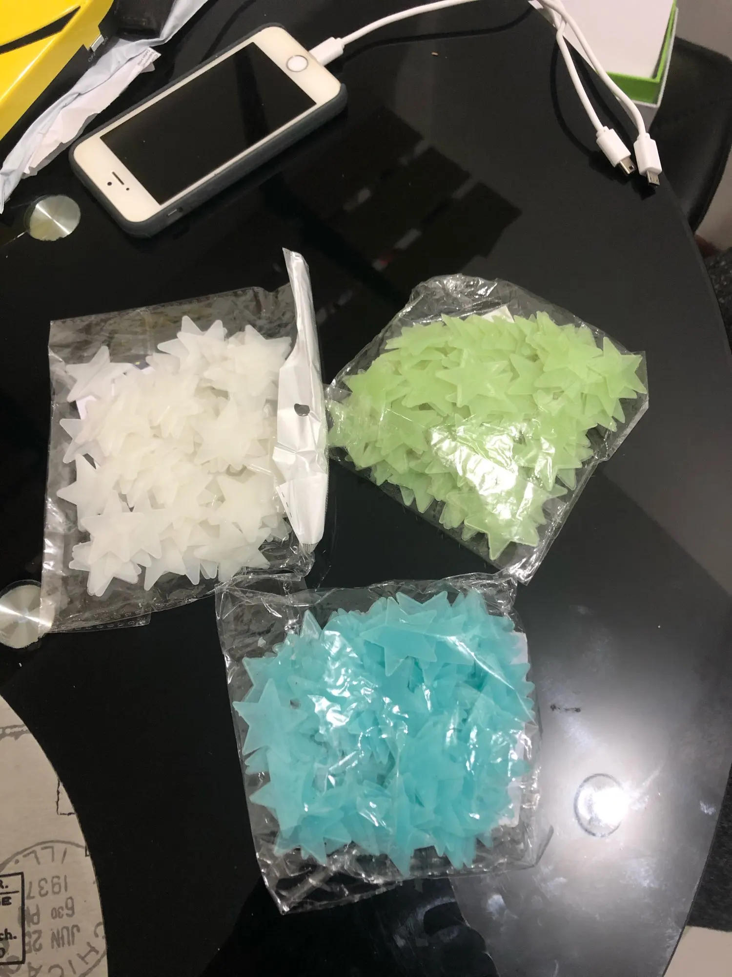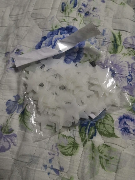Всё пришло в целости и сохранности! Очень понравилось в белом цвете что Днём их не видно на обоях. Но ночью дочка спит с ночником и их не очень видно, да и быстро потом перестают сиять. А так всё супер. Наклеили по периметру комнаты вверху.