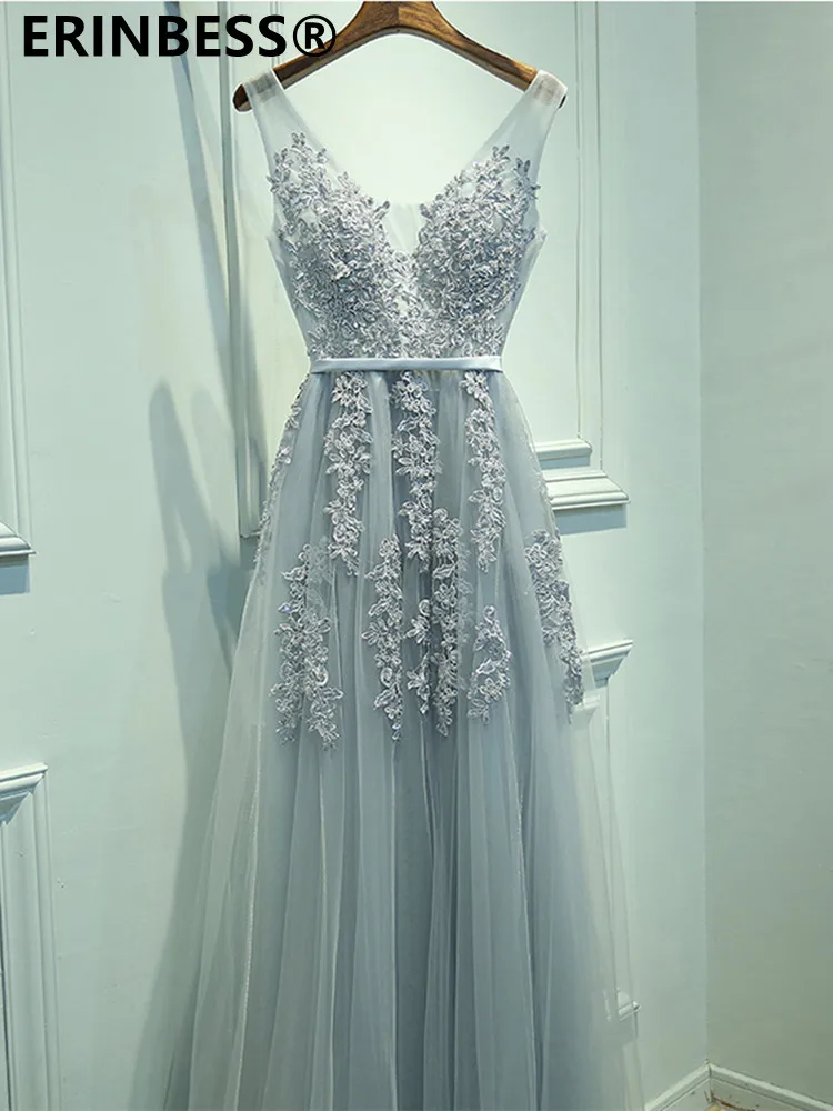 Женское вечернее платье с V-образным вырезом, серое фатиновое платье с вечерние платья с аппликацией, настоящие фото, 2020