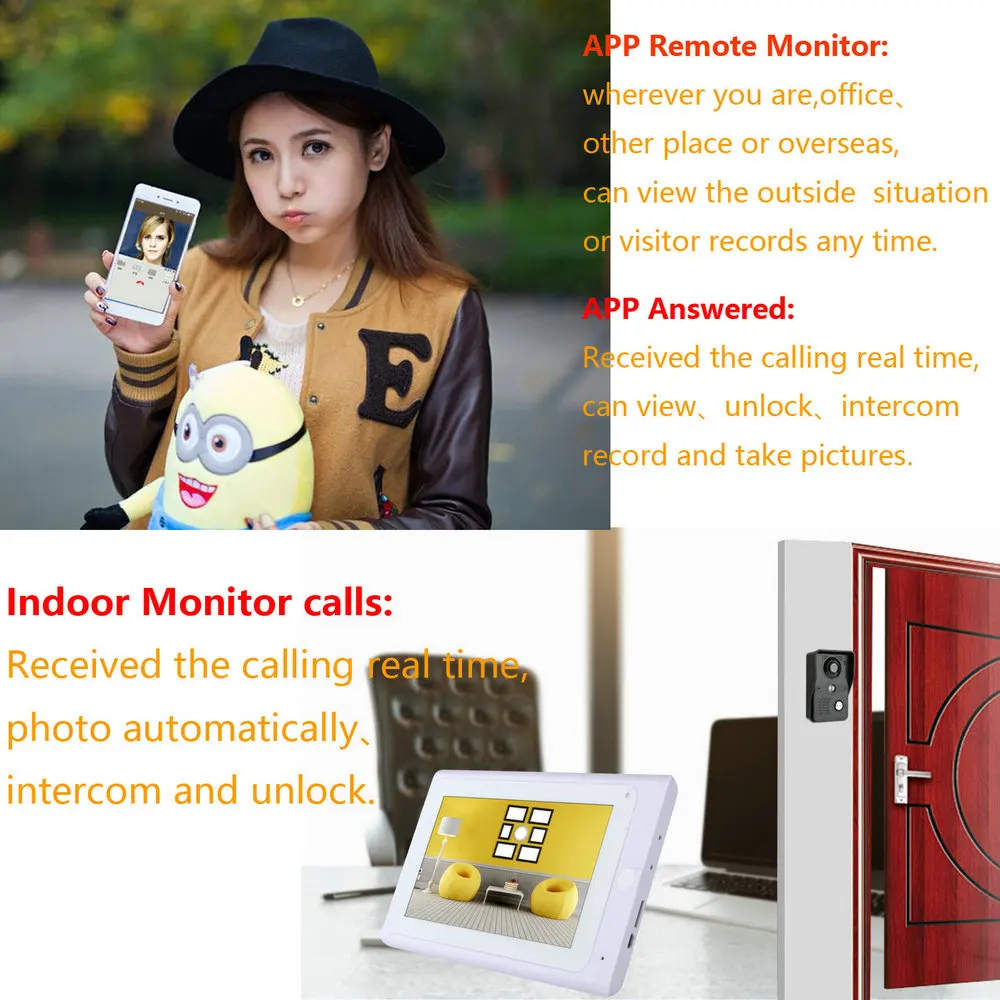 Простая установка самостоятельно с адаптером и кабелем, который мы предоставили в этом комплекте, внешний блок может подключаться к монитору внутри помещения проводным кабелем 6P. При подключении внутреннего монитора к беспроводному Wi-Fi роутеру, вы можете подключить мобильный телефон к монитору внутри помещения, затем мобильный телефон также может записывать видео или открывать дверь и т. Д. Широко используется в виллах, квартирах, домах, гостиницах, Офисы, общественные здания и так далее.