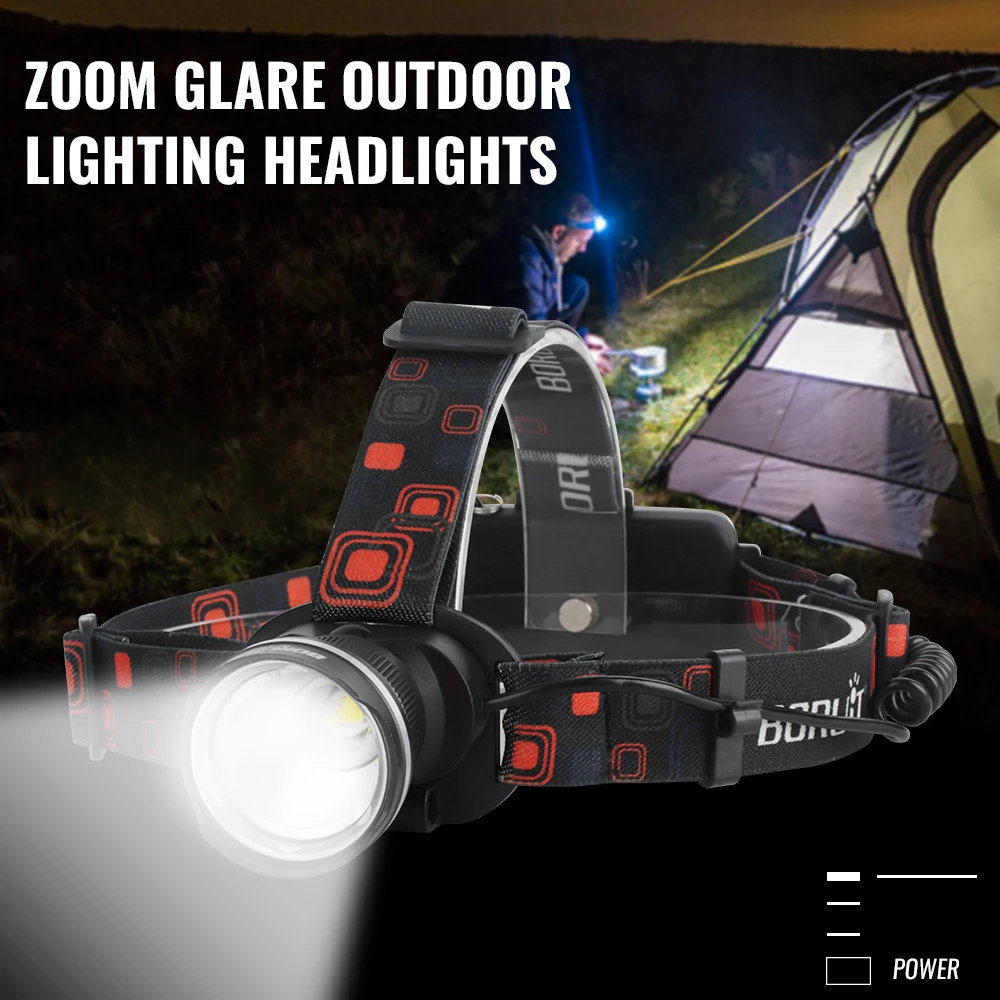 Налобный фонарь BORUiT RJ-2190 T6, светодиодный, 3000лм, 3-режимный, с зумом, перезаряжаемый, 18650, водонепроницаемый, для кемпинга, охоты