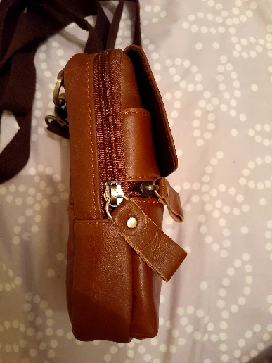 The smell of leather is strong. The size was as planned and a smartphone entered. The straps are good metal fittings, but the belt is cheap. I was satisfied because the price was cheap.