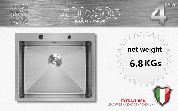 Премиум SUS304 Нержавеющая сталь строительства на подкладке для ребенка (верх и низ) Толщина: 4 мм сверхтолстая, толщина стали 1,2 мм стандартная толстая). Уникальная ручная (ручная работа) кухонная раковина от VIBORG. Действительно отличное коммерческое качество устойчивая к царапинам прямая матовая отделка Может непосредственно связаться с пищей, противостоять эрозии, окислению, высокой температуре и старению, не впитывает масло, навсегда нержавеющий и не приводит к повреждению физического тела. Экстра-глубокая миска 21 см для размещения больших предметов, с минимальным разбрызгиванием воды Радиус круглых углов (R10 углов) для легкой очистки. С каналами, спроектированными для оптимального слива воды на поверхности раковины. С высококачественной корзиной для быстрого слива воды. Звукоизоляция с сверхтолстыми резиновыми амортизирующими прокладками. Размеры: 500x505x220 мм, размер чаши: 450 мм x 400 мм Посылка включает в себя 1 кухонную раковину, как описано, с ситечком для корзины и сливными трубами.Примечание: кран, дозатор жидкого мыла иКорзина для слива (корзина для фруктов и овощей)В комплект поставки не входят.
