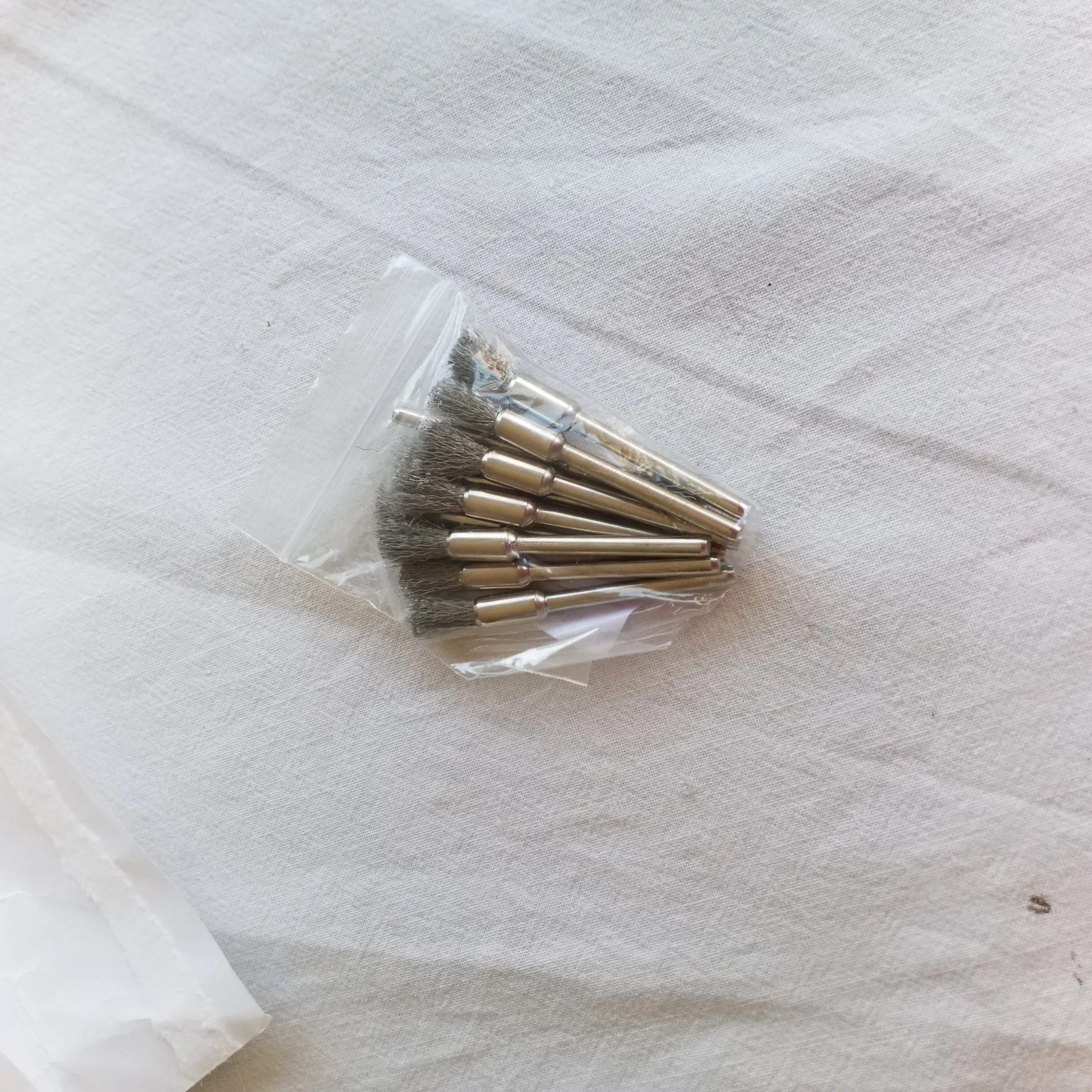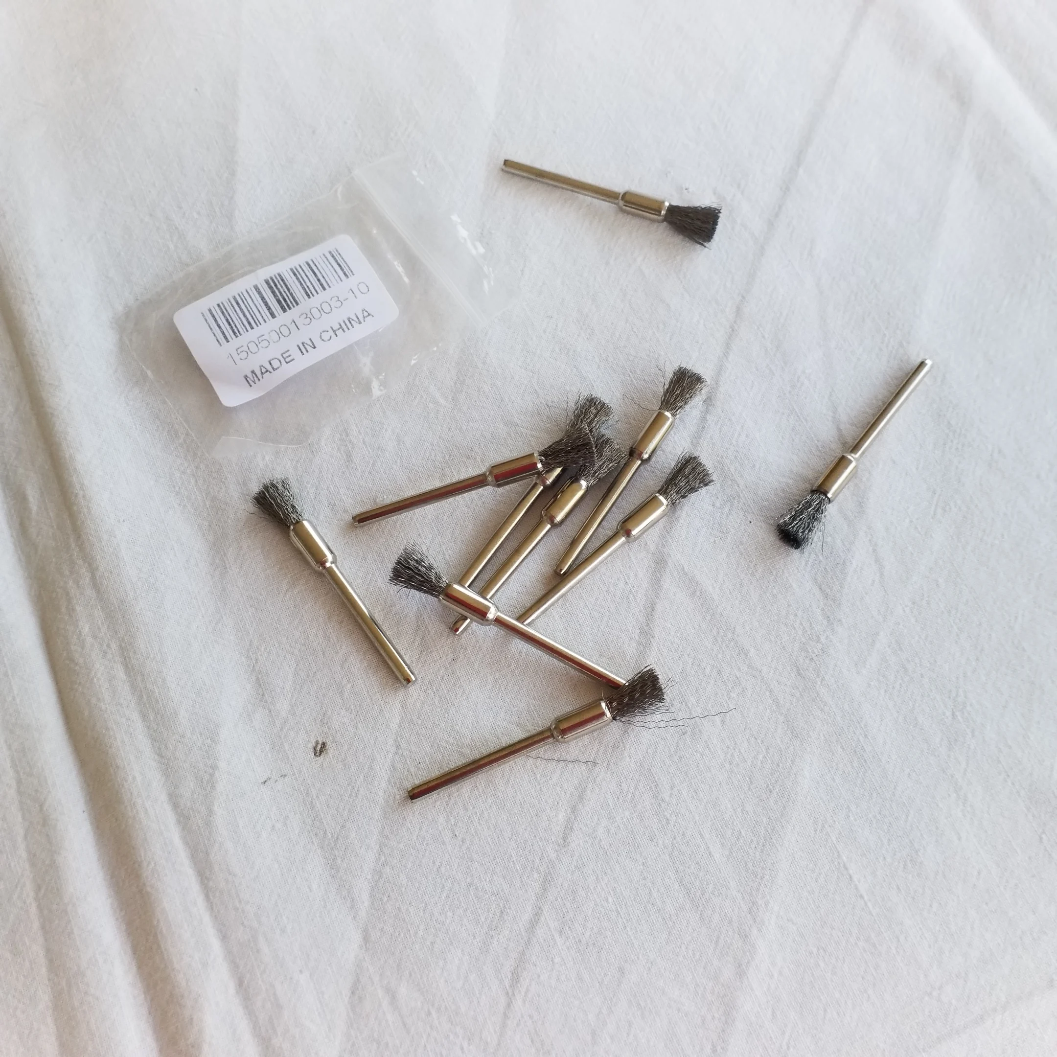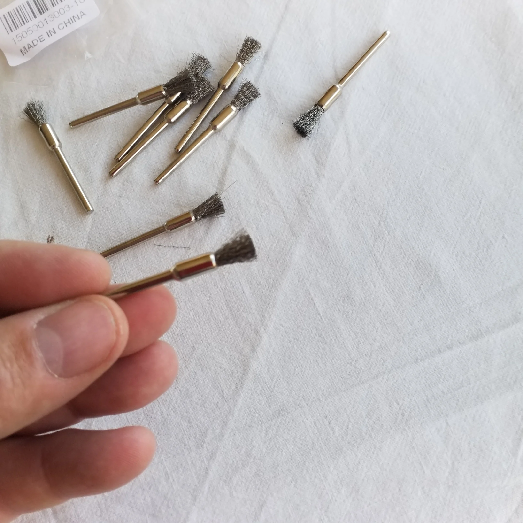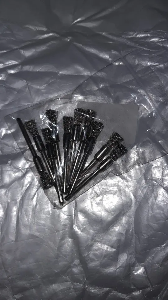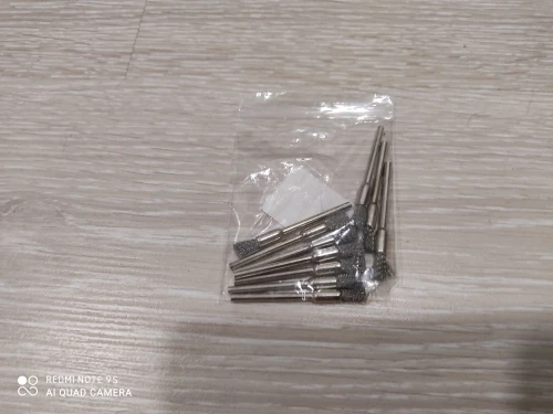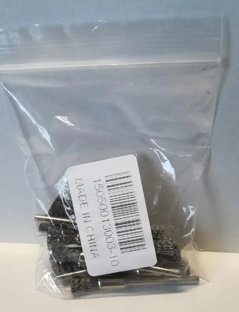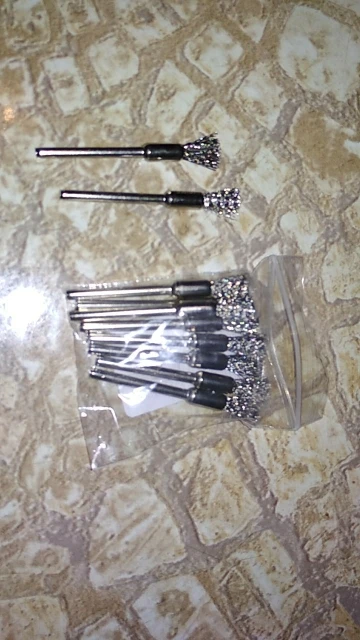 Посылка пришла за 50 дней, трек-номер отслеживался частично. Упаковано в плотный пупырчатый пакет + маленький (на фото). Все целое, ничего не сломано, да и ломаться тут особо нечему, просто щетки. Покупал для использования с электроотверткой (через патрон который тут же покупал) и для маленького шуруповерта. Чистить всякие мелкие детали типа карбюраторов весьма удобно. Если ставить в высокооборотистый гравер - щетки начинают разлетаться, что весьма опасно. Брал именно под малооборотистые инструменты. Продавцу спасибо, хорошая цена за хорошие щетки!