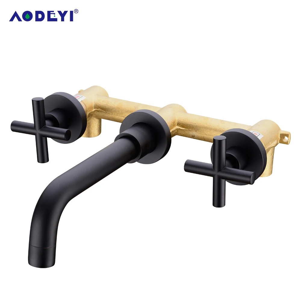 Матовый черный латунный кран с двойной ручкой, настенный кран для раковины, кран для горячей и холодной воды, смеситель для раковины, матовый золотой кран