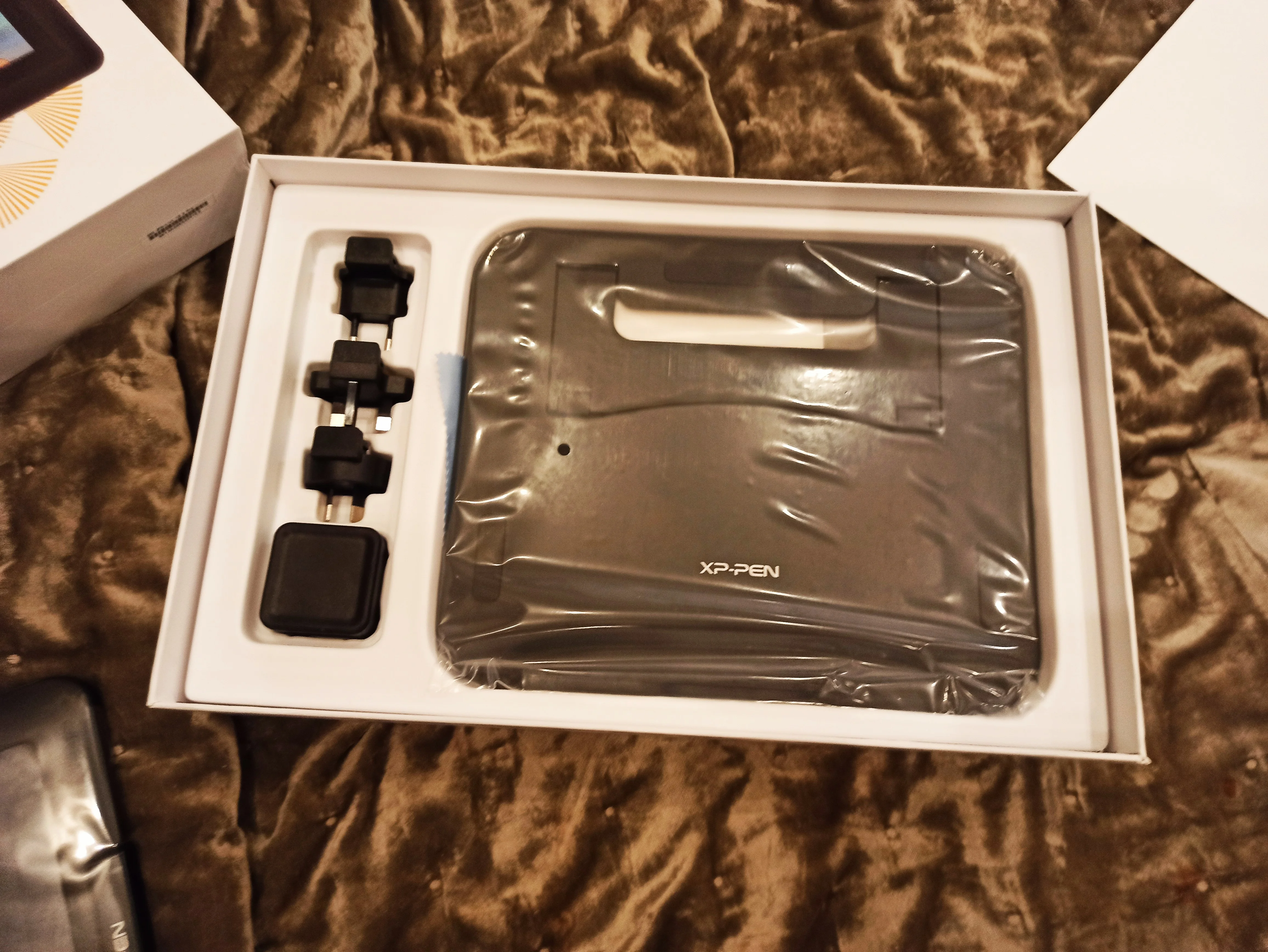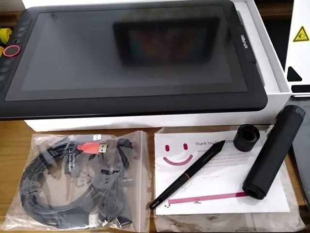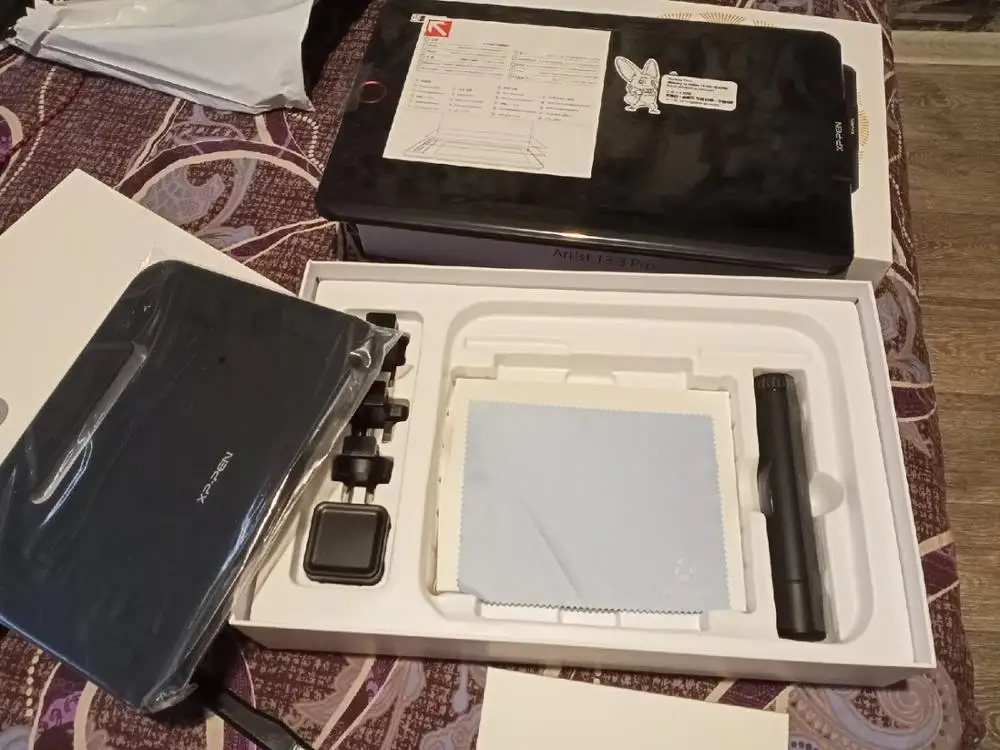 Планшет очень классный. Работает здорово. Пришёл даже очень быстро. В комплекте всё: перчатка, стилус с наконечниками, провода, сам планшет, инструкция, подставка и штучки для розетки разные виды. На нём рисую уже 3 дня и очень довольна.