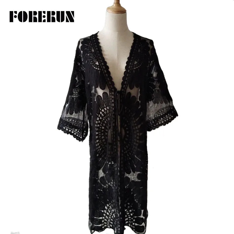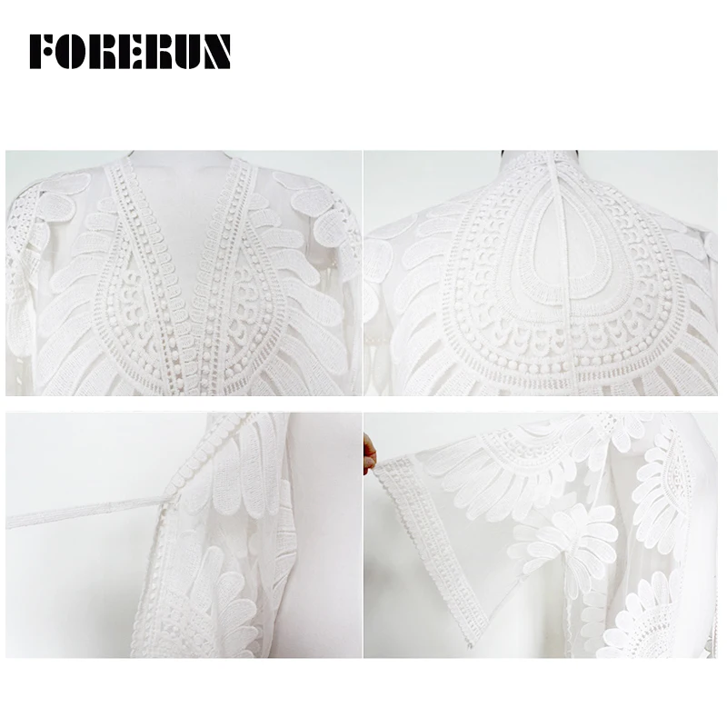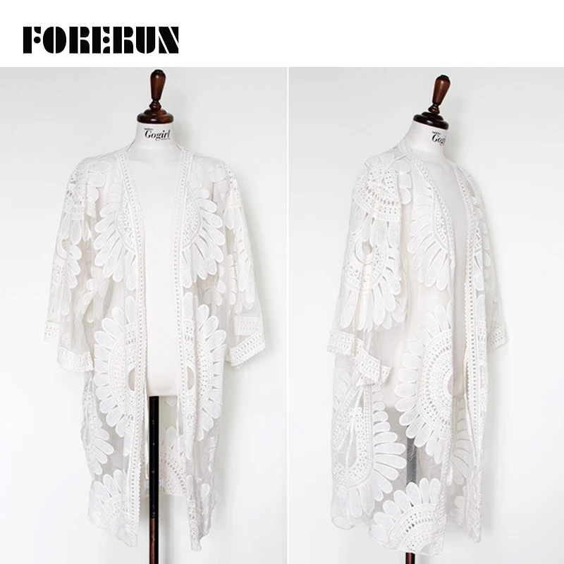 Женские пляжные блузки с цветочной вышивкой FORERUN, прозрачный белый кружевной кардиган-кимоно, летний солнцезащитный кардиган в богемном стиле
