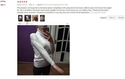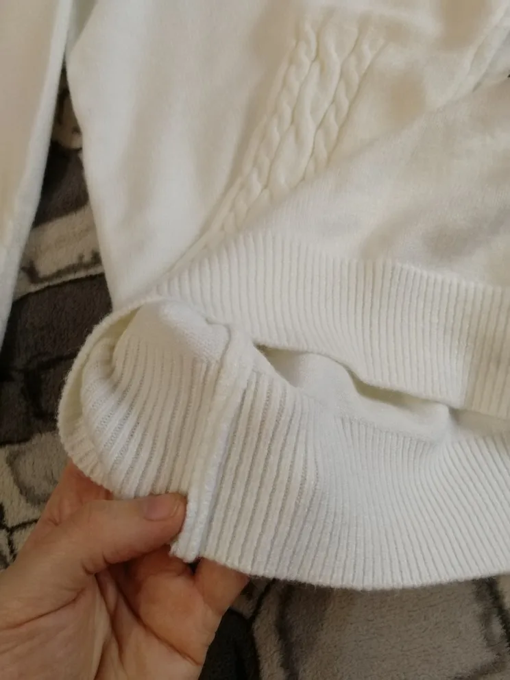 Свитерок пришёл целым. Очень красивый в реале. Цвет как на фото. Очень мягкий и приятный к телу. Все швы прошиты ровно и хорошо. Есть фабричный запах, как обычно у новых товаров (не только китайских). Но это не проблема, так как я всегда все новые вещи стираю. На мои параметры L сел хорошо (ОГ 92, ОТ 69, ОБ 95 рост 170см) только рукава могли бы быть немного длинее. Но и так неплохо. С продавцом не общалась. В Польшу в пункт выдачи дошло за 2 недели. Товар и продавца советую.