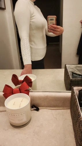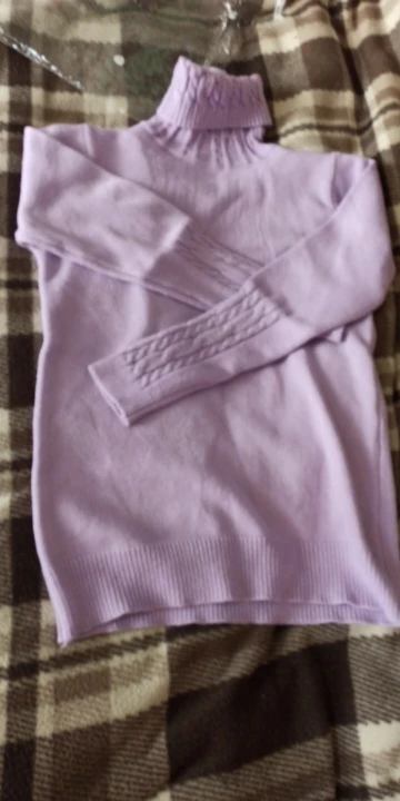 Свитер мягкий,приятный к телу.Заказ пришёл быстро.Размер заказала L,хотя ношу М. В подарок продавец положил резинку для волос.Спасибо