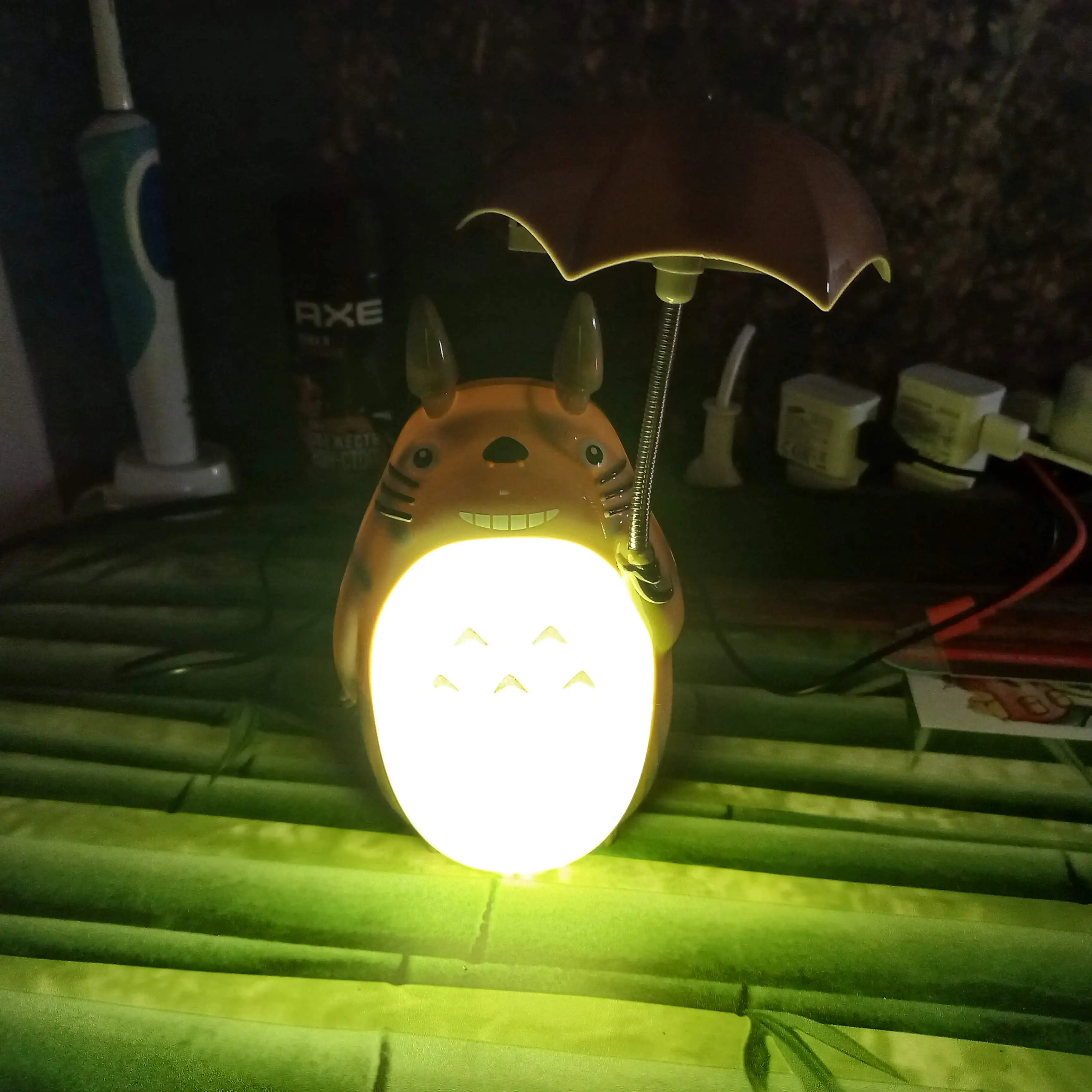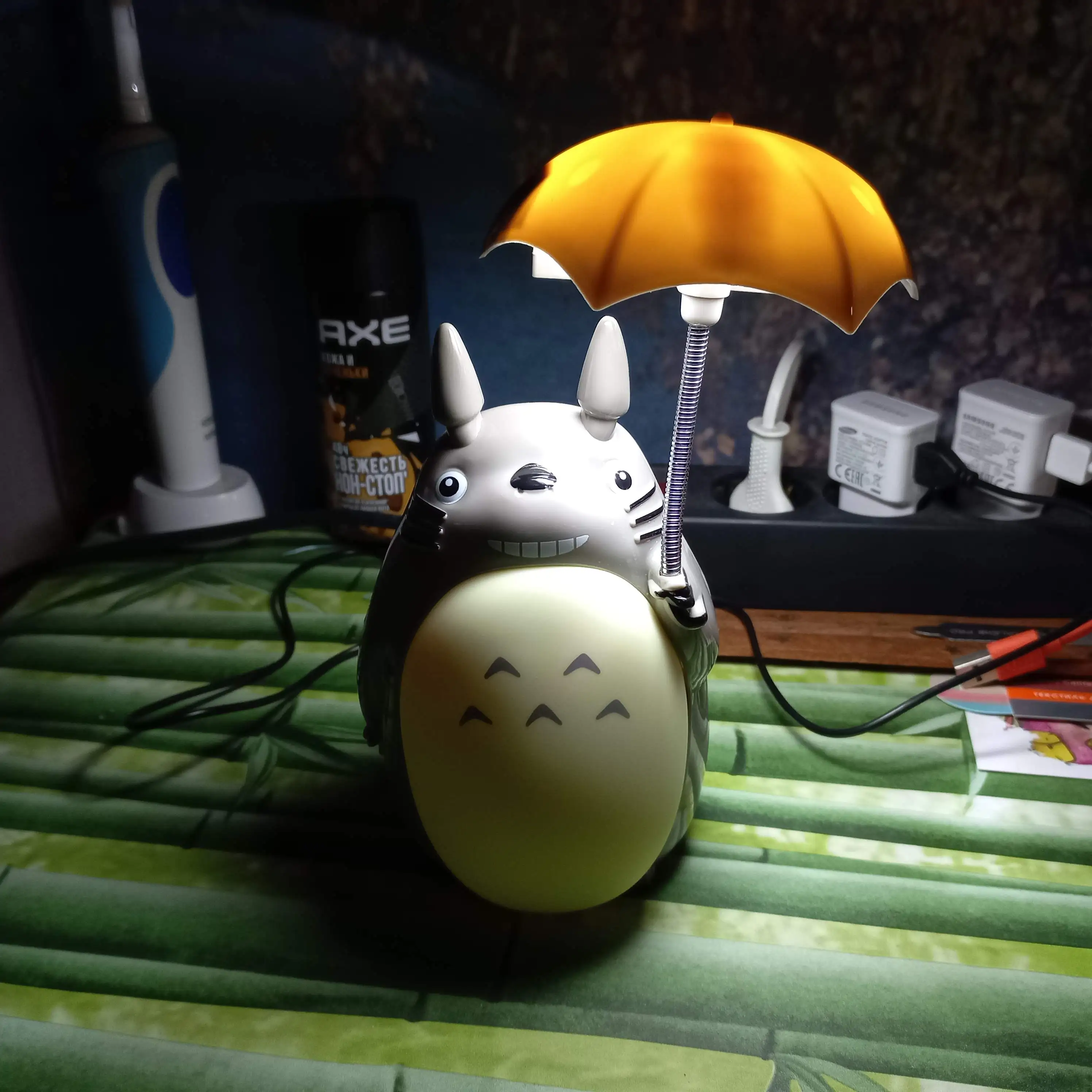 Замечательный маленький светильничек, в комплекте usb-провод для зарядки. Жаль в комплекте не предусмотрена розетка для такого провода, так что зарядка от компа или ноута, либо если завалялась лишняя usb-розетка, то от нее . Все упаковано на высшем уровне, пришло в полной сохранности. Когда стоит на зарядке светится красным пятном в районе груди Тоторо. А так светильник включается следующим образом, либо светится пузико, либо горят светодиоды под зонтиком. Ручка у зонтика гибкая, гнется в любую сторону. Светильник аккумуляторного типа, можно зарядить и поставить где удобно. Материалы все очень качественные, чудесная копия волшебного героя из мультфильма Хаяо Миядзаки))) Продавца и товар рекомендую 100%!