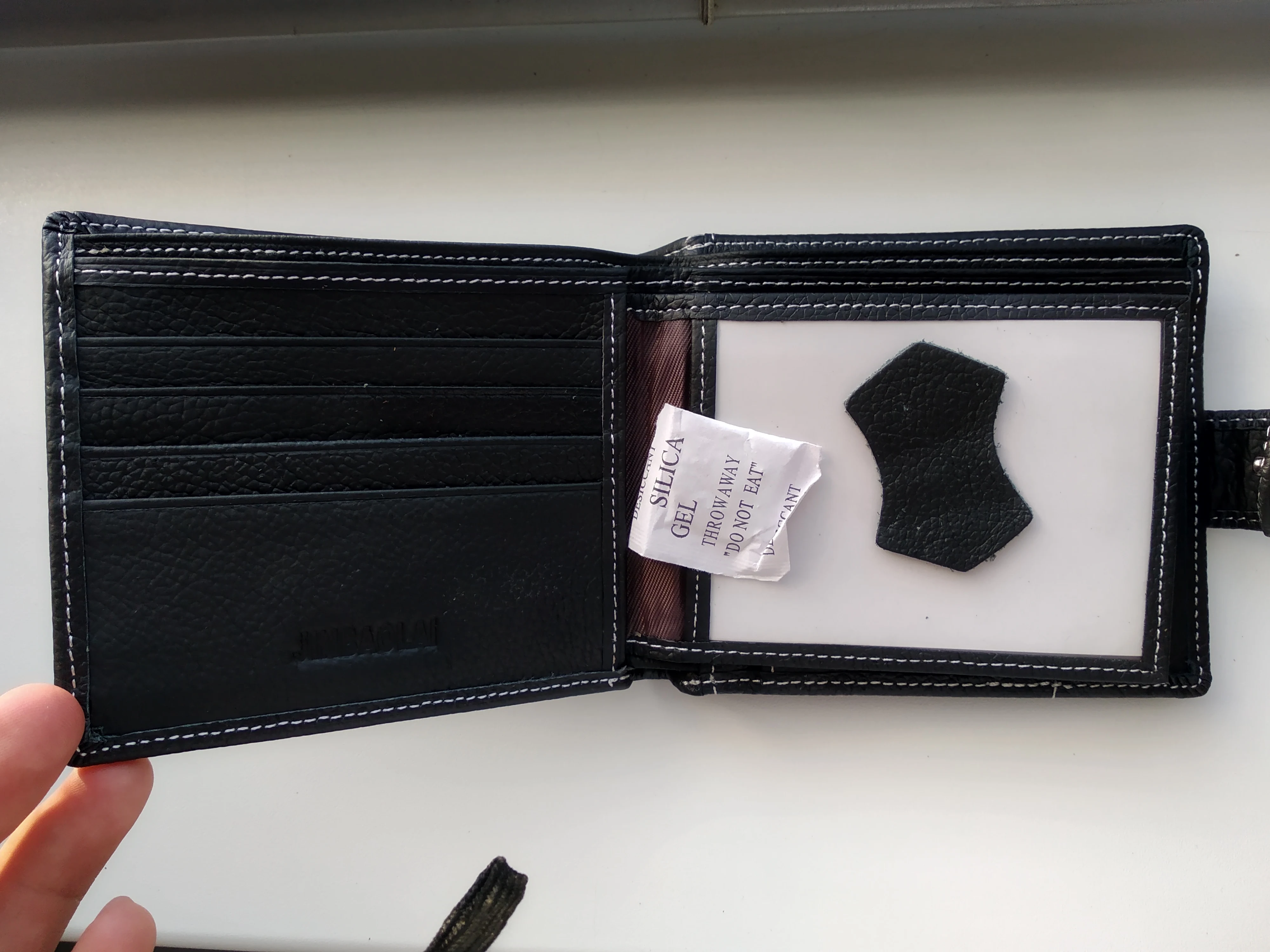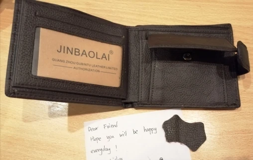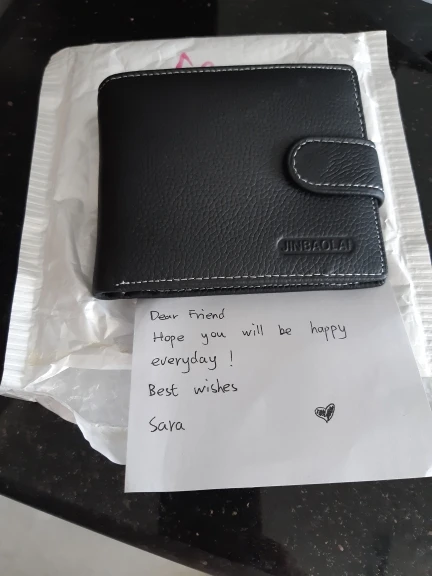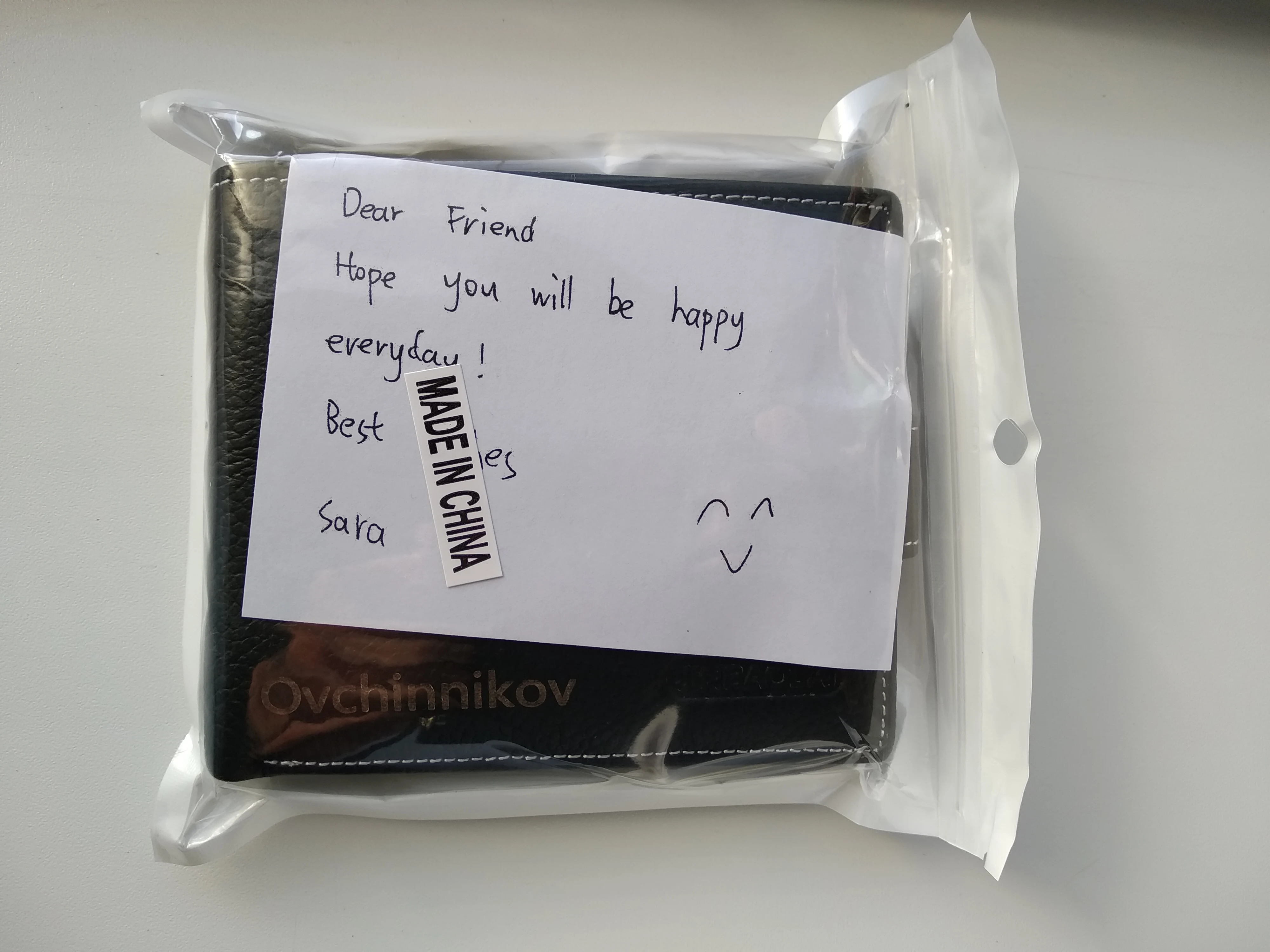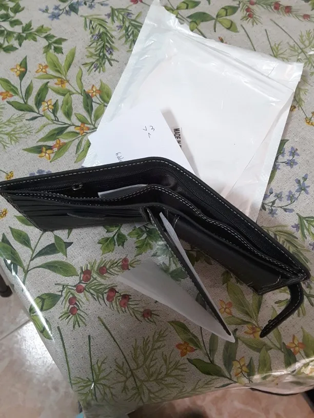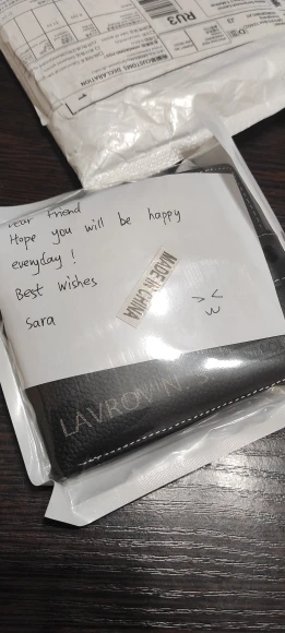 Покупкой доволен. Пользуюсь со второго дня как получил, и уже недель две... Достав в магазине для оплаты на кассе, иногда через маску ощущается запах нового кошелька (не скажу что вонючий. Просто запах нового). Строчка ровно сделана. В целом на вид хорошо сделан. Плюс так как это моя первая была посылка с Али, то было очень приятно было ещё и получить написаны от руки хорошие пожелания от продавца Sara )))))