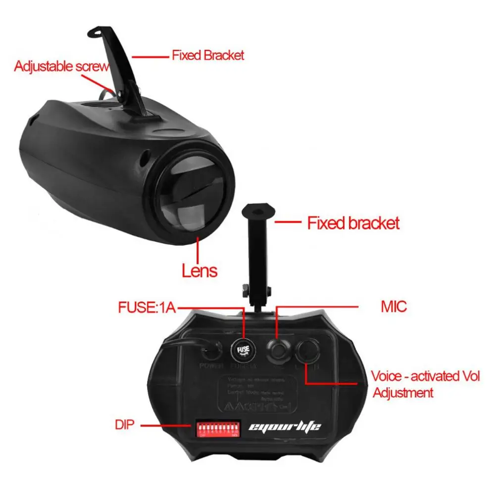 Особенности:-Уникальный внешний вид, выглядит как крутой Маленький дирижабль.-Светодиодный эффект лунного цветка с очень толстыми 4-х цветными световыми лучами красного, зеленого, синего, белого цвета.-Встроенные световые шоу-программы, широкий разворот луча охватывает большую площадь.-Умный размер, легко устанавливается.-Стробоскоп и вращение рисунка со звуковой активацией и автозапуском режимов, сотни динамических изменений.-Подходящие места: диско, Бальные залы, КТВ-залы, бары, сцены, вечеринки и гостиницы, свадьбы и т. Д.