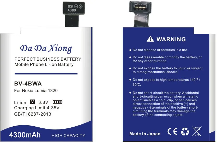 100% Оригинальный Da Xiong новый и высококачественный аккумулятор. Емкость:4300 мАч Напряжение: 3,8 V Тип: li-ion Совместимость: дляNokia Lumia 1320 Безопасность и окружающая среда: двойные функции защиты. Двойная электрическая плата IC и PCB защищают от разрядки заряда и короткого замыкания. Наша батарея того же размера с оригинальной батареей. Два года гарантииПосылка включает в себя: